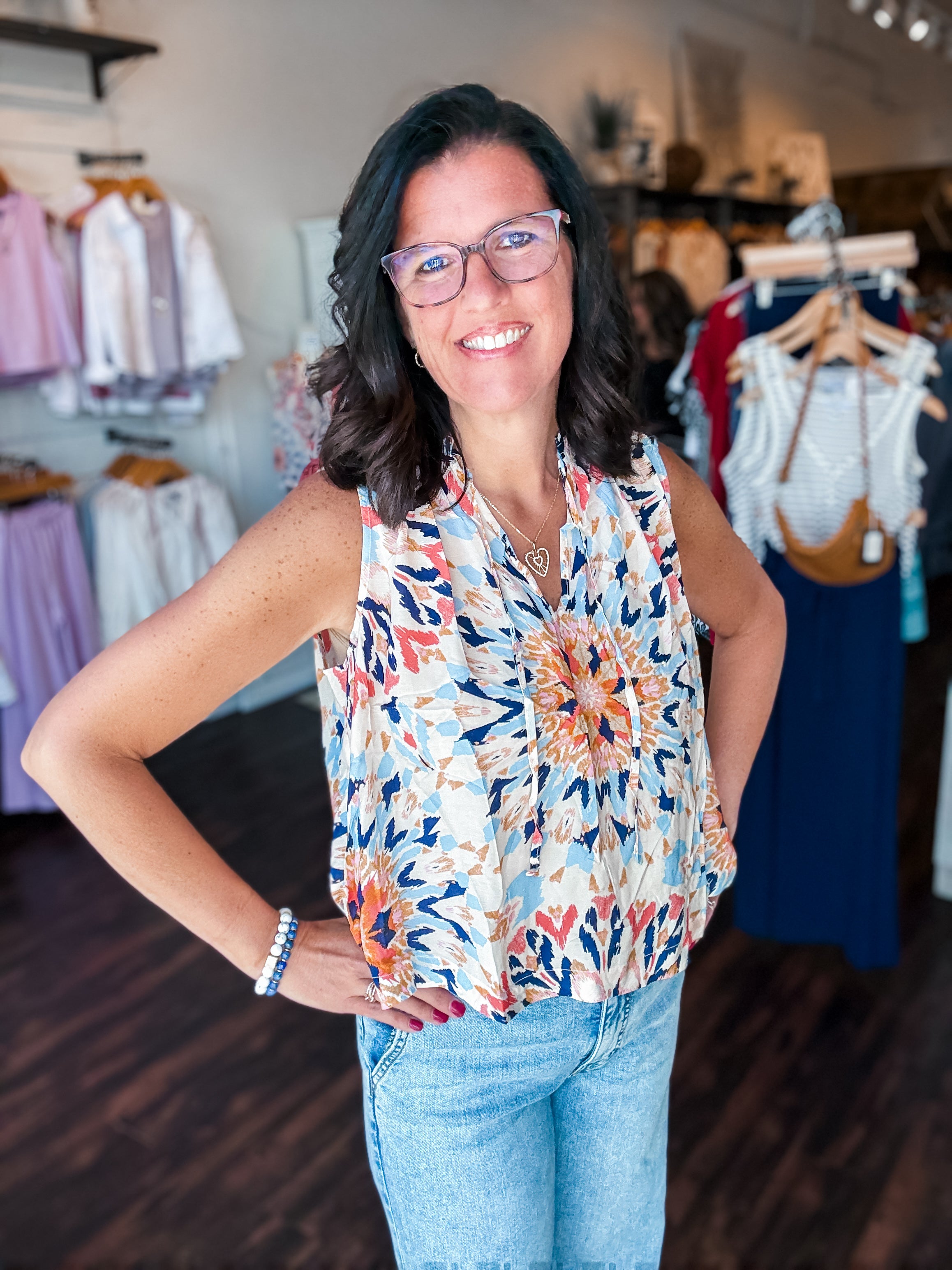 Sleeveless Flowy Colorful Top Brighten your day with this vibrant sleeveless top that celebrates color and movement. The relaxed, flowing silhouette offers effortless comfort while the cheerful palette works with everything in your closet. Perfect for warm weather adventures, casual outings, or layering over your favorite basics. Light and breezy, it's the go-to piece for anyone who loves a splash of joy in their style.