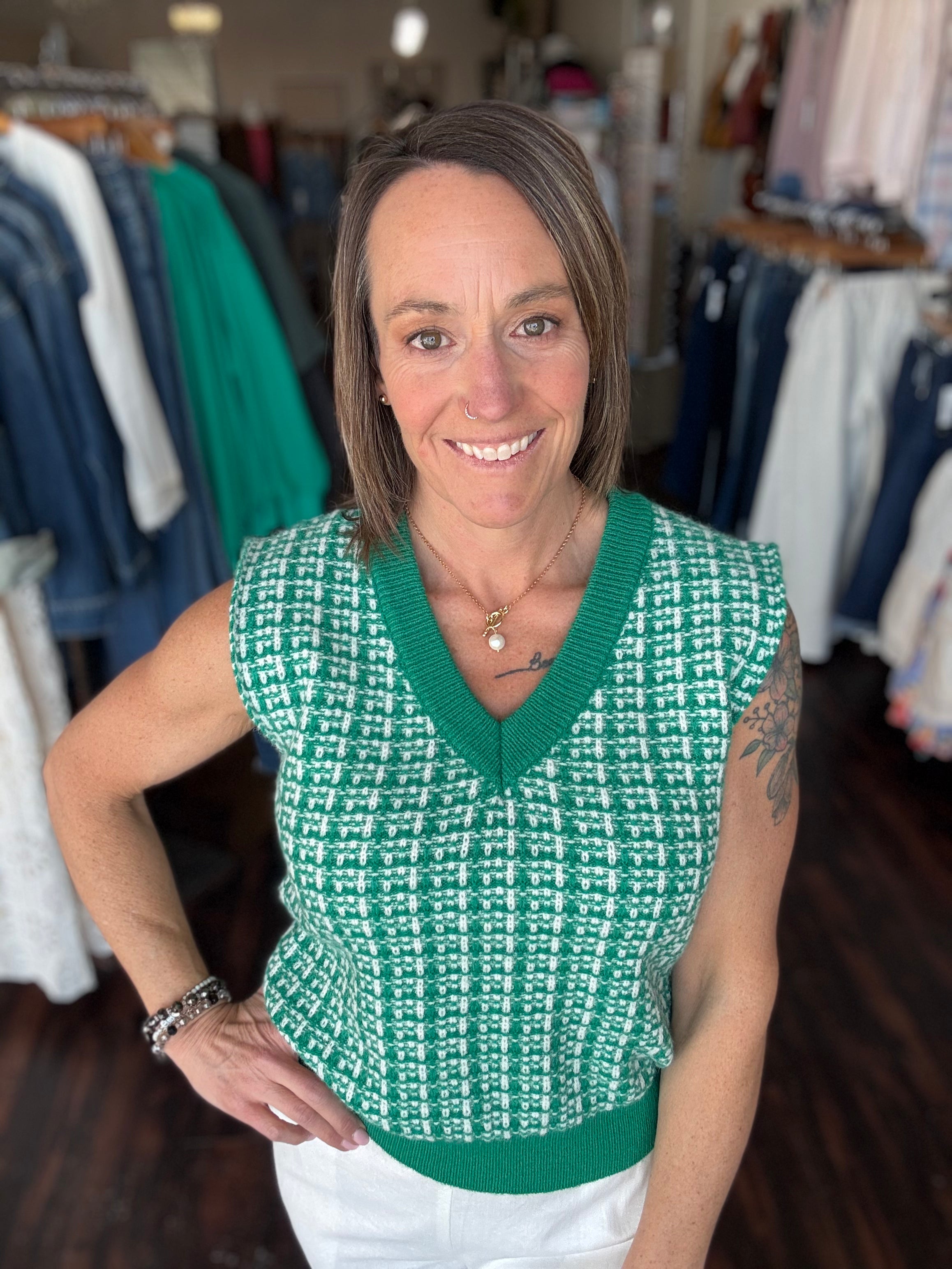 Add a pop of fresh color with this Green Sweater Vest Top! Its cozy knit and vibrant green hue make it a playful twist on a classic favorite. Layer it over a button-down or wear it solo for a fun, stylish look that brightens up any outfit.