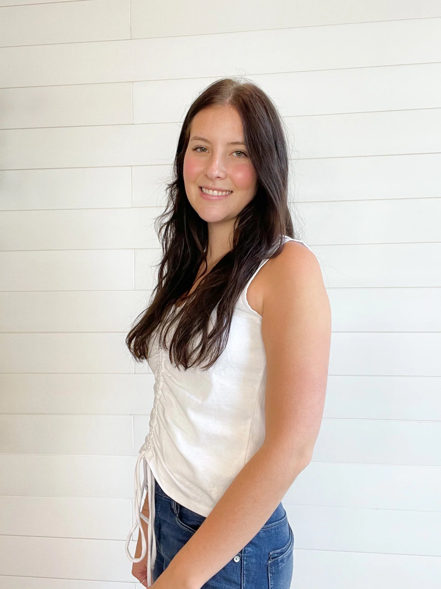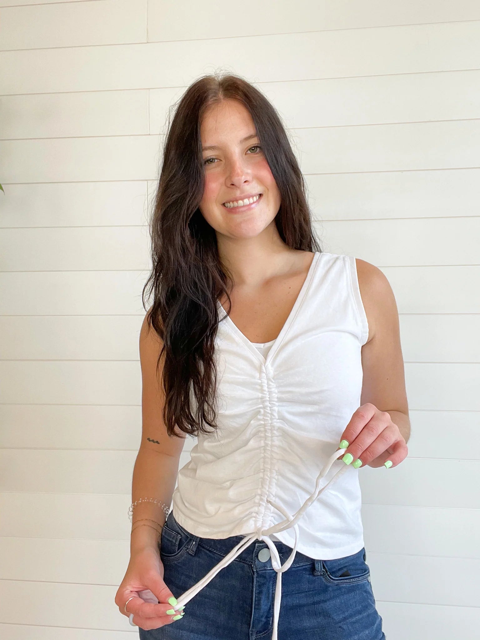 Add a flirty twist to your wardrobe with this Tie Ruched Sleeveless Top. The playful ruched detailing creates a fun, textured look, while the tie accents bring a touch of charm. Perfect for sunny days or layering, it pairs effortlessly with your favorite jeans or skirts for a lively, carefree style.