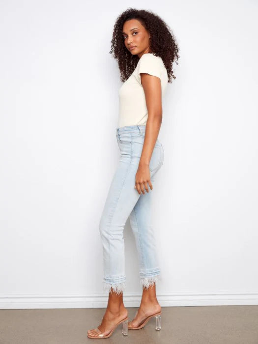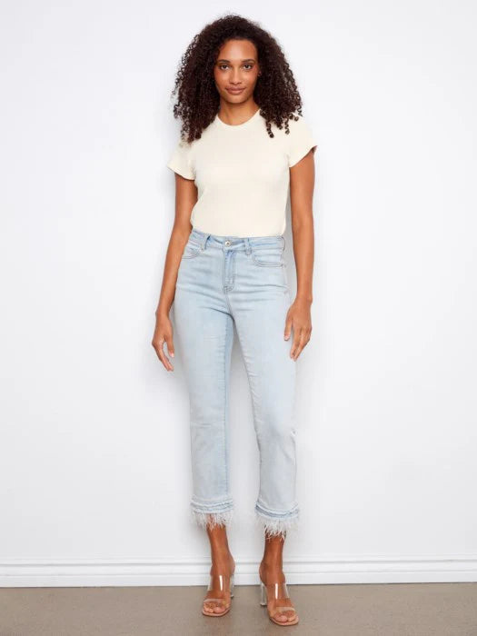 Stretch Denim Flare Pant With Feather Trim