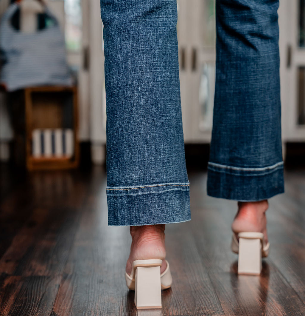 Bring playful sophistication to your denim collection with these cropped kick flare jeans. Designed with a flattering mid-rise fit, this style skims the hips and thighs before flaring subtly at the hem. A standout cuffed hem detail adds polished structure and fashion-forward charm, while the medium blue wash with light fading gives it a lived-in, versatile look. Perfect for dressing up or down—just add heels or sneakers.
