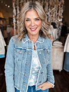 Throw on this Fringe Edge Stretch Denim Jacket and instantly level up your casual game. The playful fringe detailing along the edges adds movement and personality to every outfit, while the stretch fabric moves with you for all-day comfort. Perfect for layering over your favorite tee or dress, this versatile jacket transitions seamlessly from weekend brunch to evening plans. A wardrobe essential that's equal parts edgy and effortless.