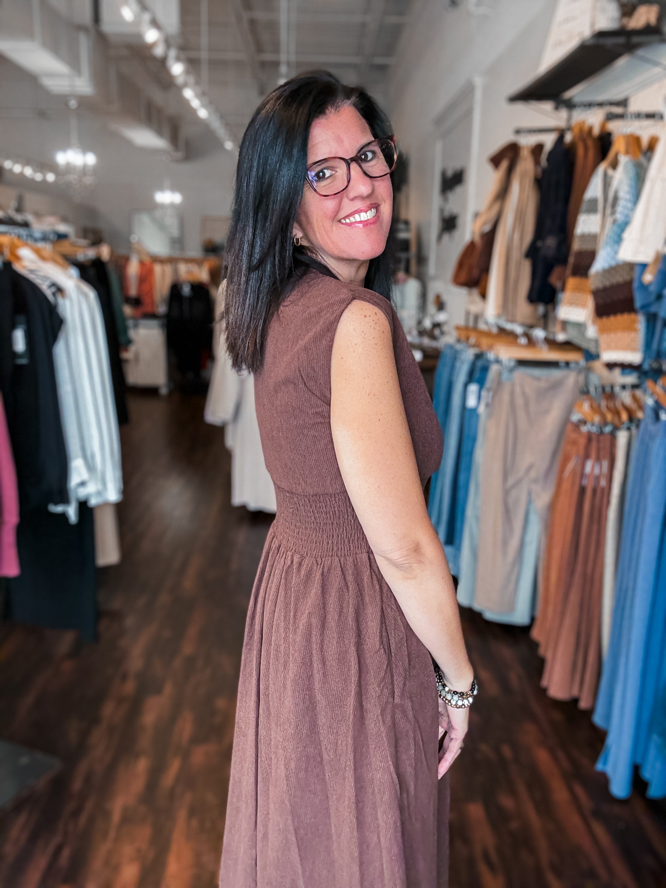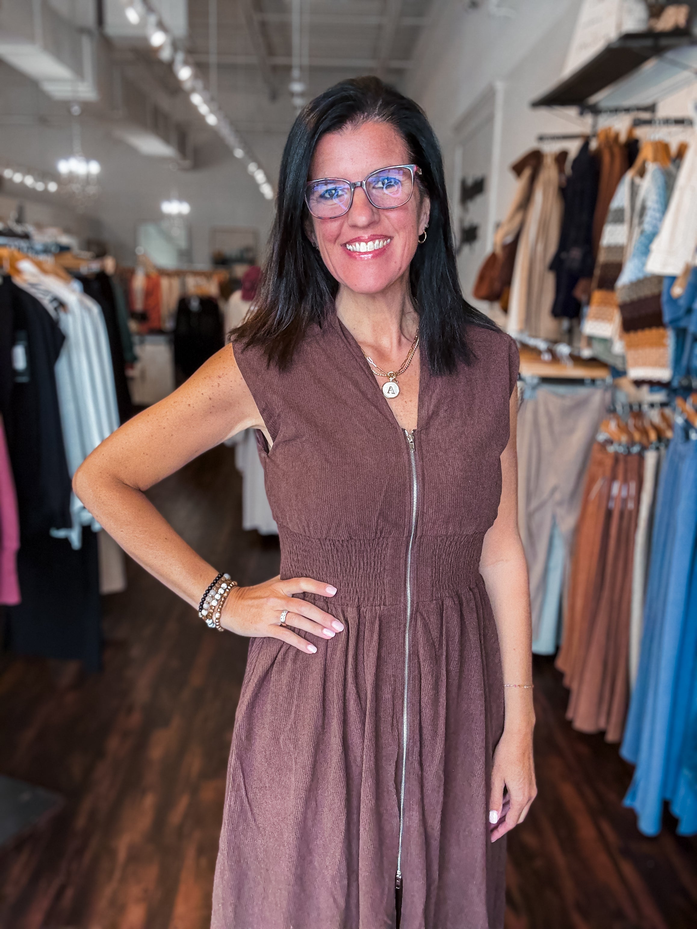 Drop Shoulder Smocked Waist Front Zip Corduroy Midi Dress W/ Pockets