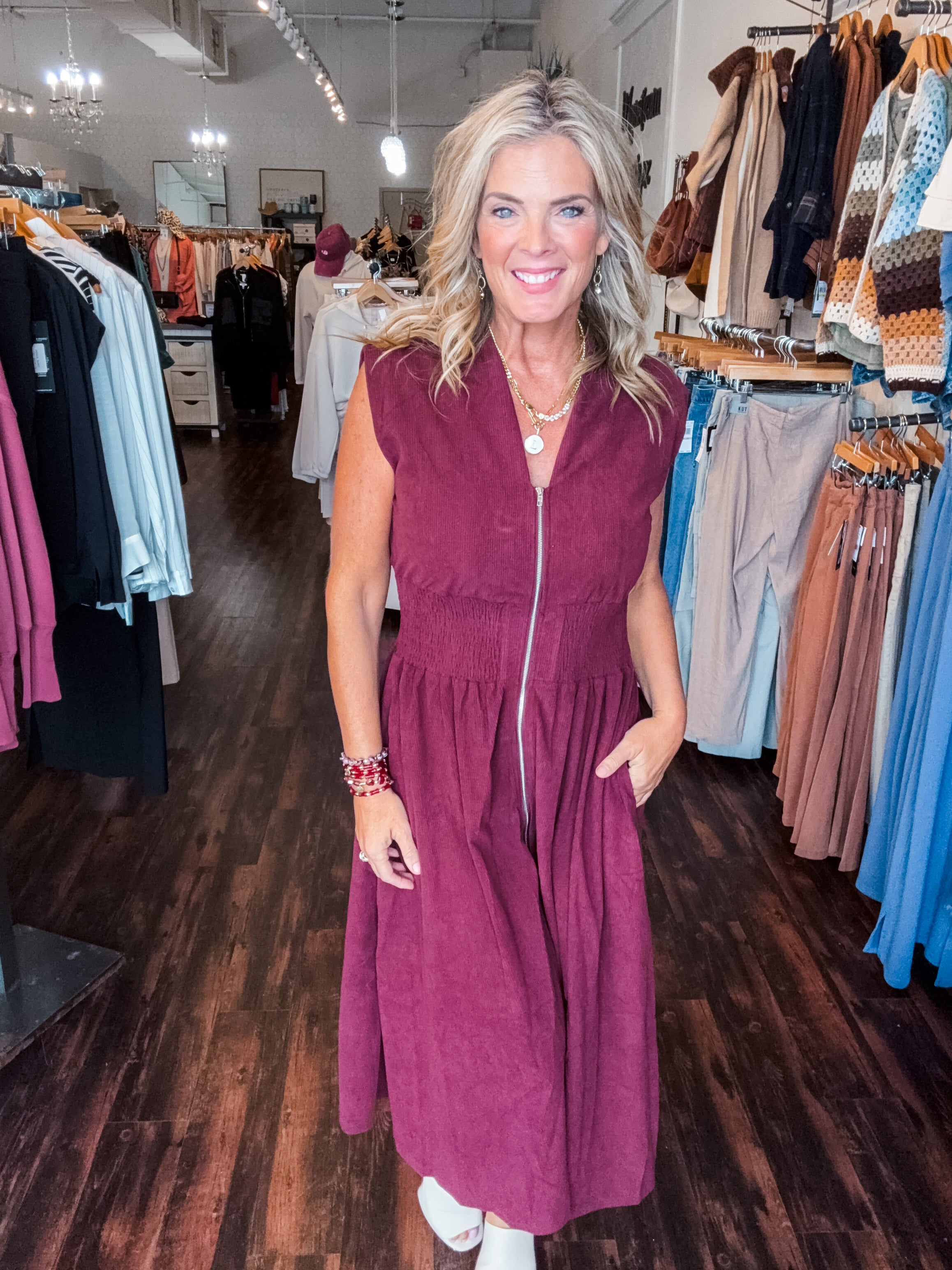 Embrace cozy charm with this playful corduroy midi dress featuring a drop shoulder design and a smocked waist that adds just the right amount of stretch for comfort. The front zip makes dressing a breeze, while generous pockets keep your essentials close and your hands free to dance. Perfect for cool days when you want to feel stylish and snug all at once.