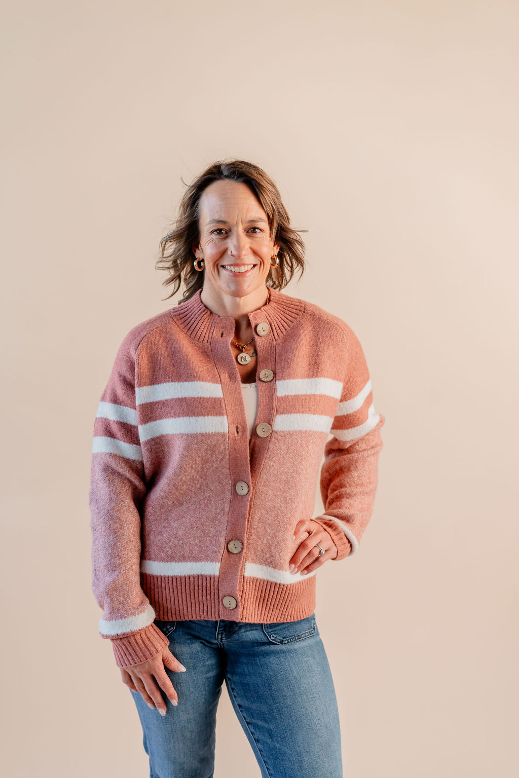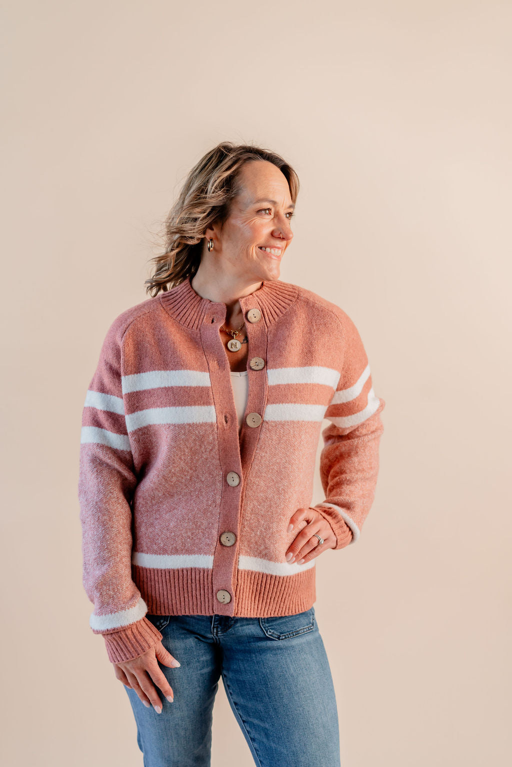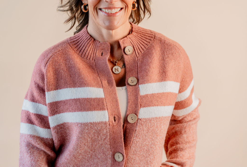 Elevate your everyday style with this Mock Neck Button Down Jacket featuring a fun striped collar. The long sleeves keep you cozy, while the button-down front adds a classic twist. Perfect for layering or wearing on its own, this jacket brings a playful pop to your outfit with its unique collar detail. Whether you're heading out for errands or catching up with friends, it's your go-to piece for effortless charm and comfort.