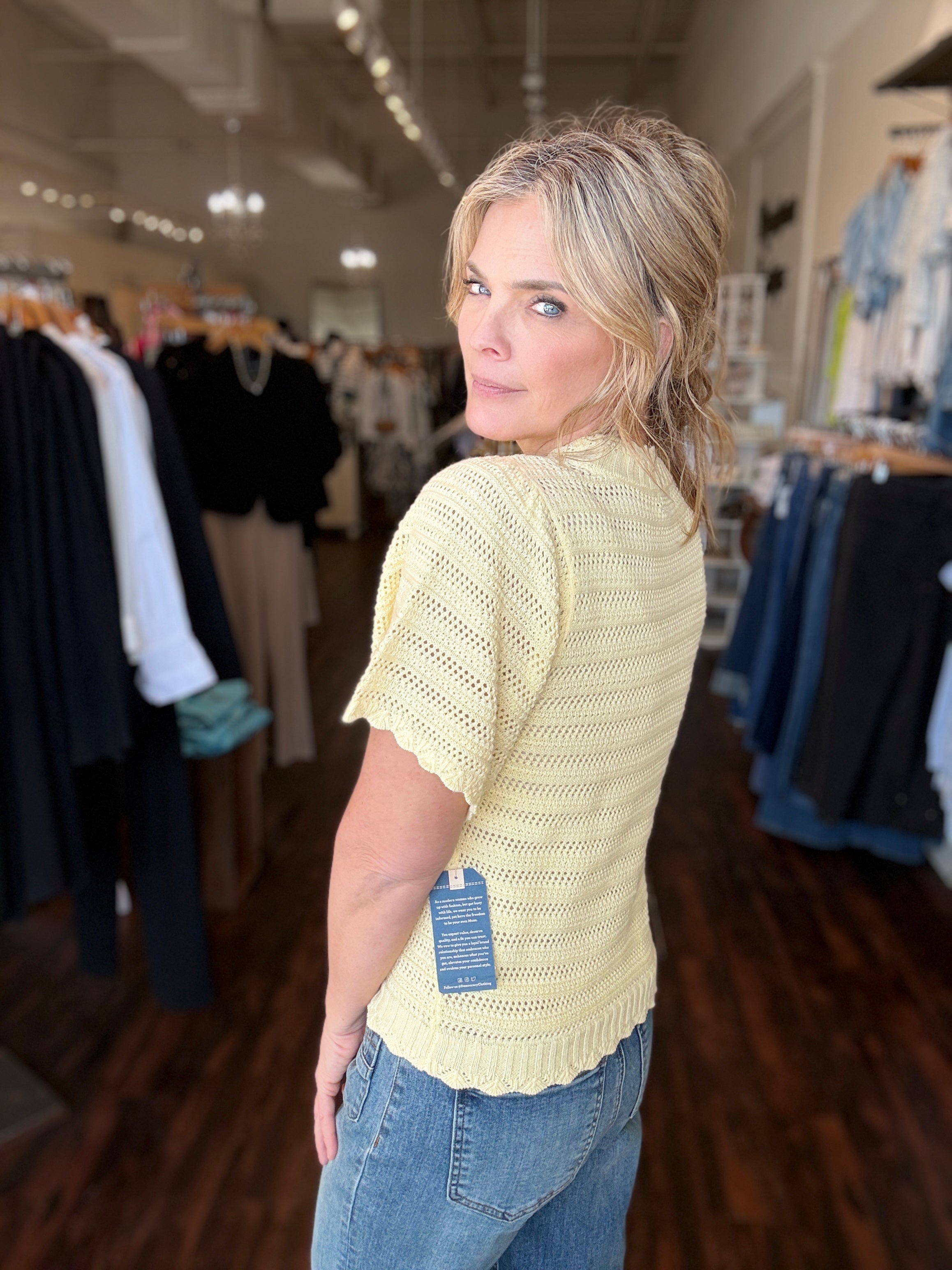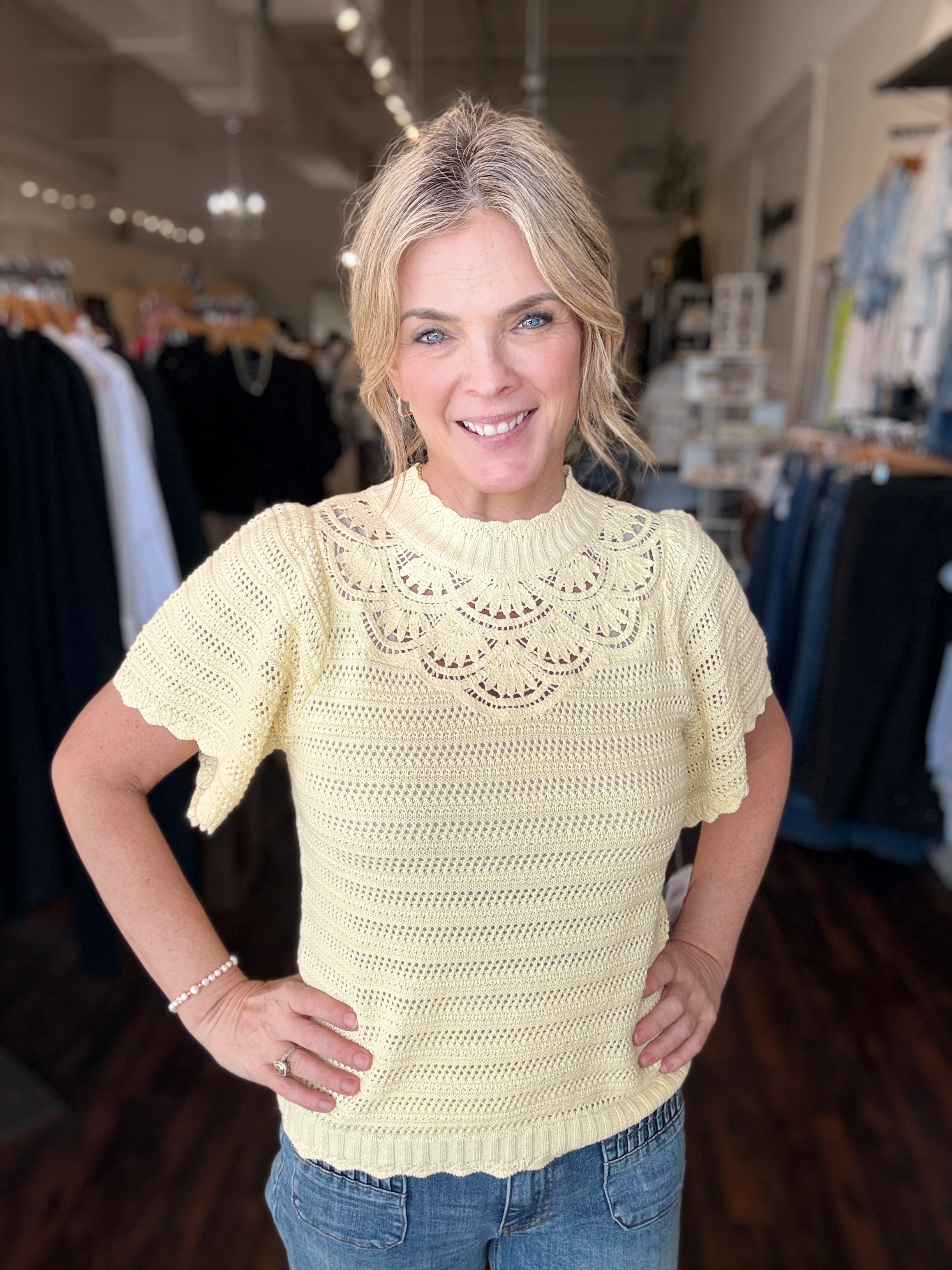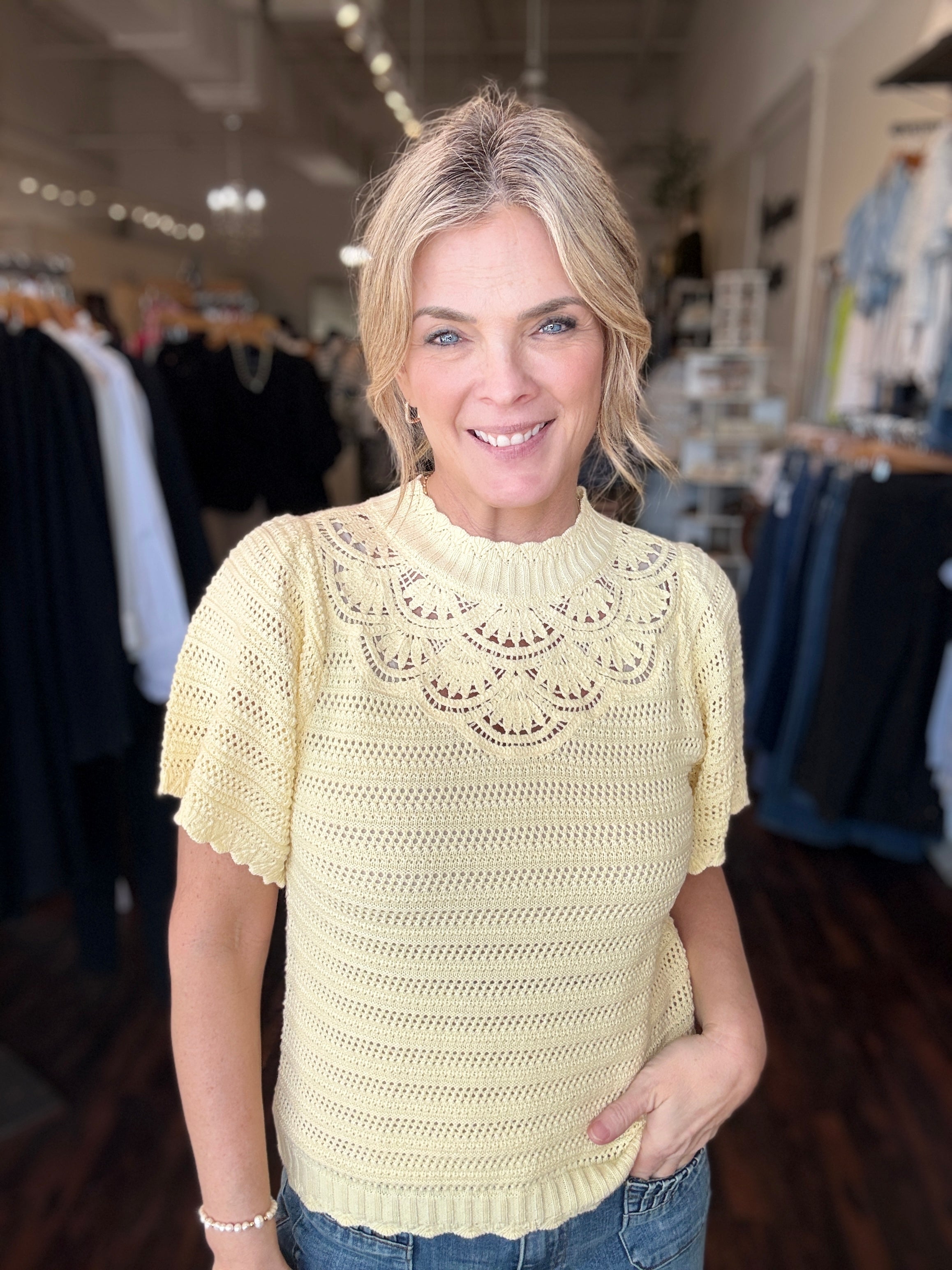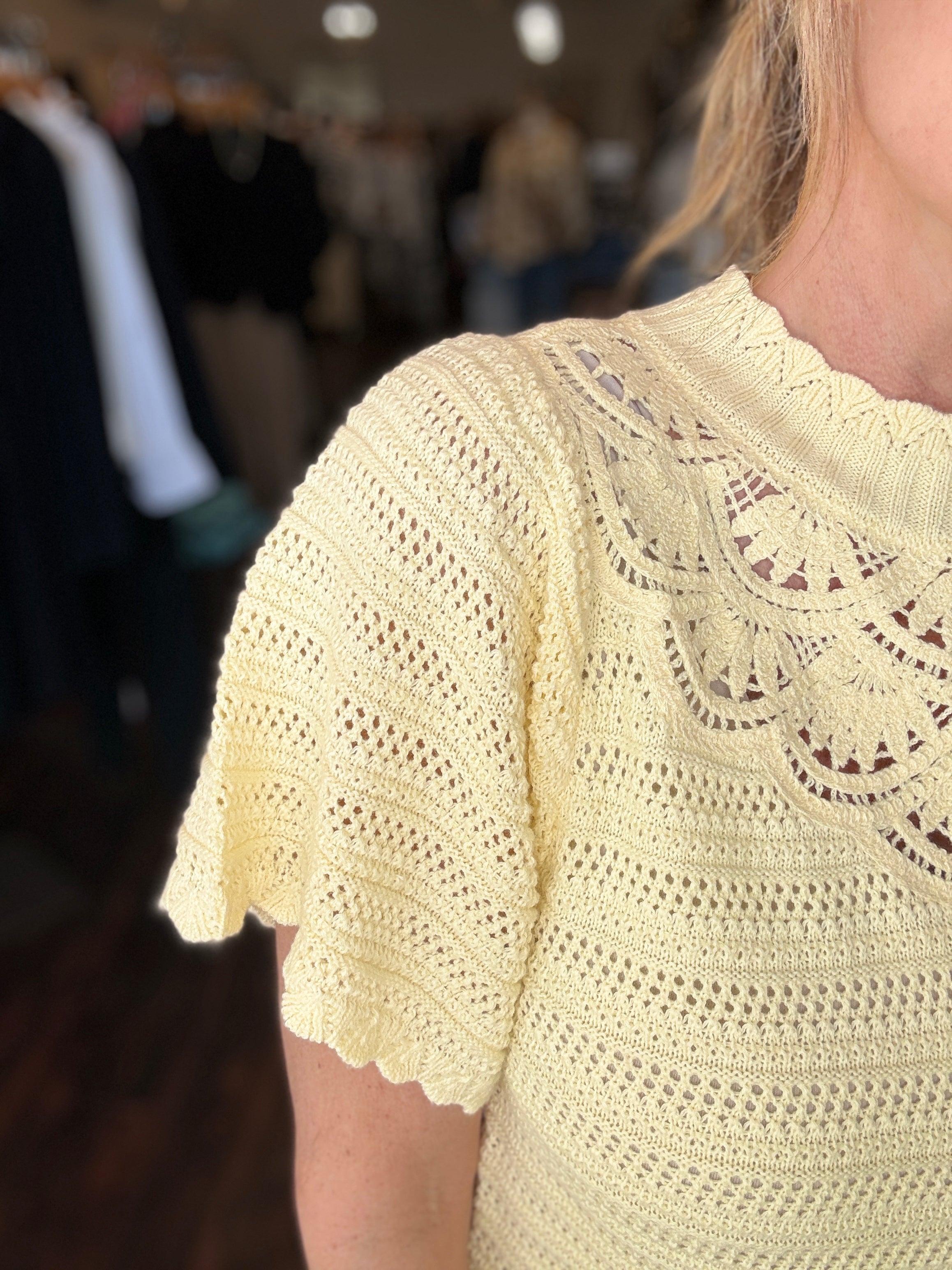 Short Sleeve Crochet Yoke Sweater