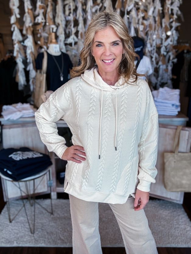 Wrap yourself in cozy comfort with this oversized cable knit hoodie—the perfect layering piece for effortless style. Featuring rich textured knit detailing and a relaxed silhouette, it's ideal for casual days when you want to look put-together without trying too hard. The generous fit pairs beautifully with everything from fitted jeans to oversized sweats, making it a versatile wardrobe essential that feels as good as it looks.