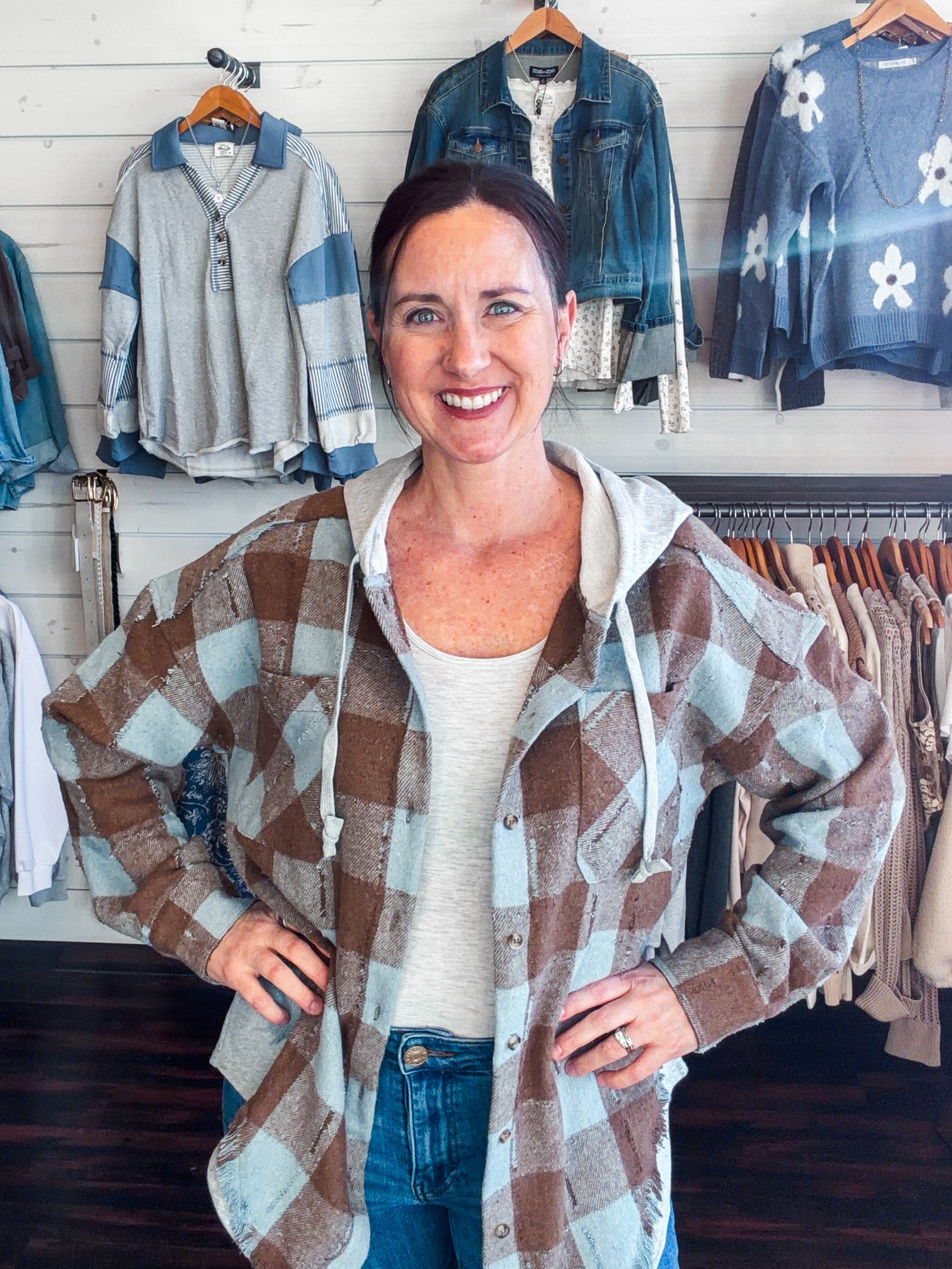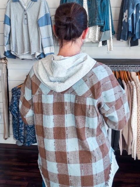 Layer up in style with this oversized flannel hooded button-down jacket—the perfect blend of cozy and cool. Featuring a classic plaid pattern, functional hood, and relaxed fit, it's your go-to piece for casual days and chilly nights. Button-down front for easy styling versatility. Whether you're heading out for coffee or settling in by the fire, this jacket delivers comfort without compromising on that effortlessly put-together vibe.
