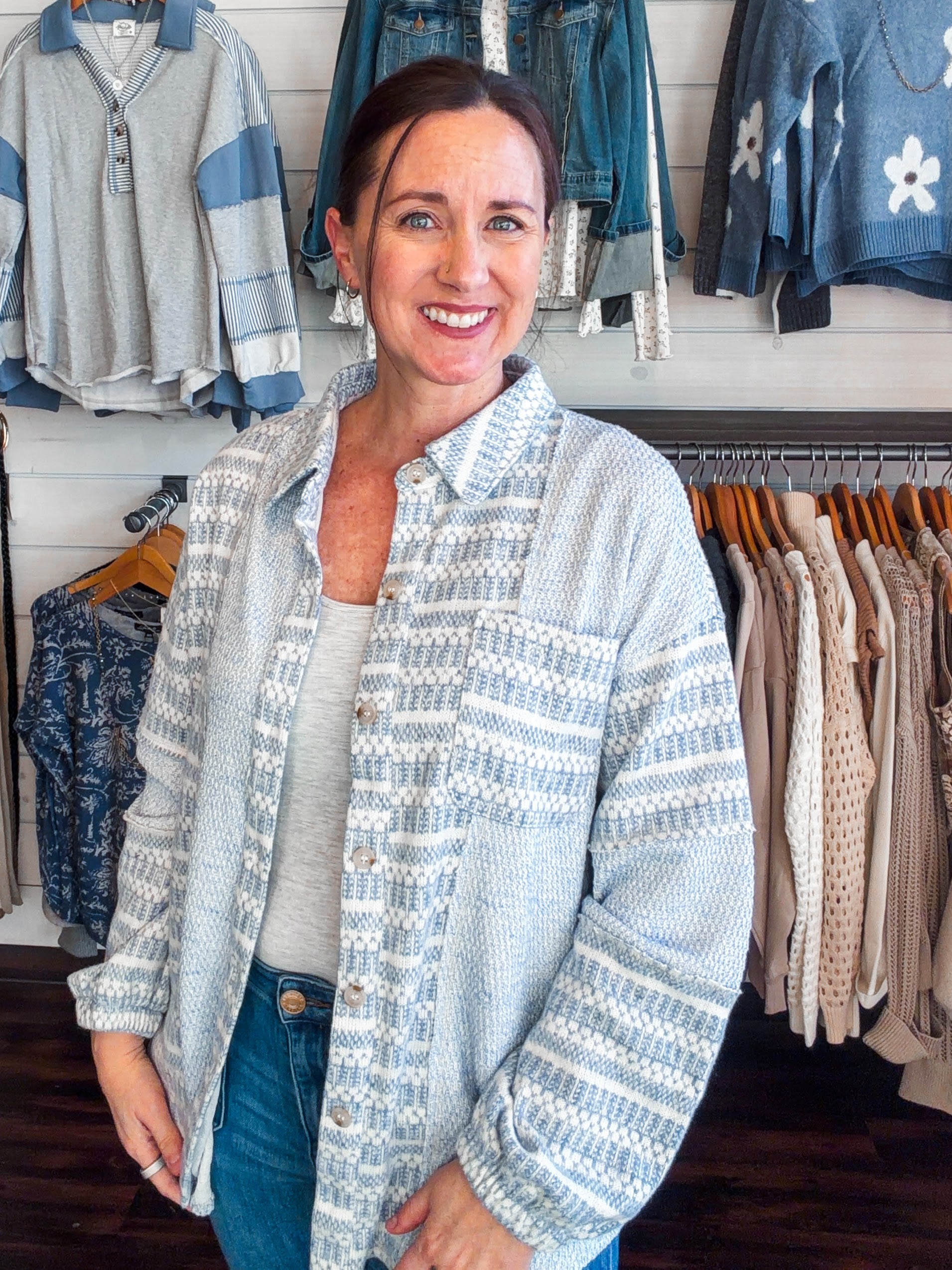 Layer up with effortless cool in this oversized shacket that blends the best of both worlds—cozy knit comfort meets casual jacket vibes. The mixed-knit construction adds visual interest and texture, while the relaxed fit lets you move freely whether you're running errands or grabbing coffee with friends. Throw it over anything and instantly elevate your everyday look. Perfect for those days when you want structured style without the fuss.