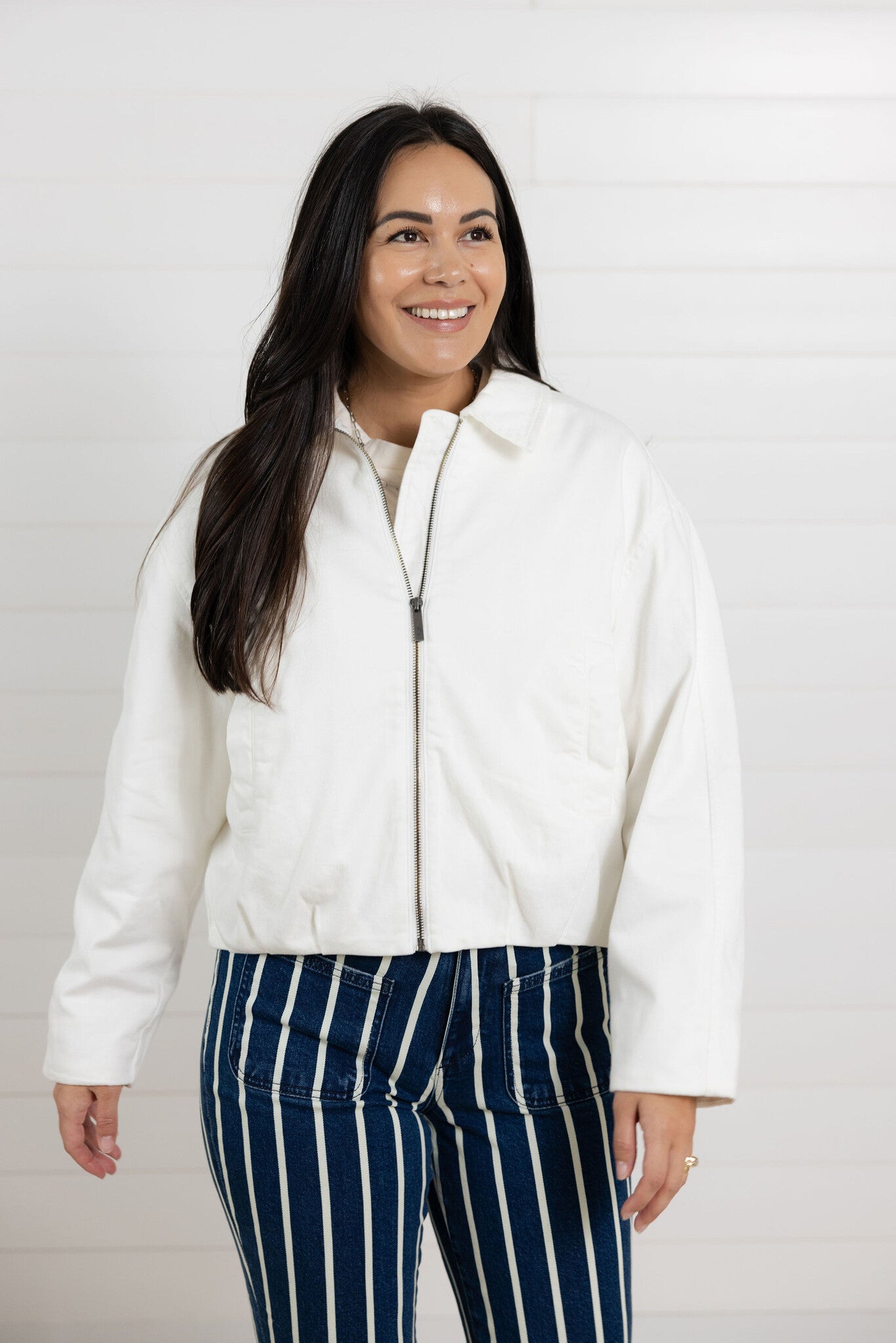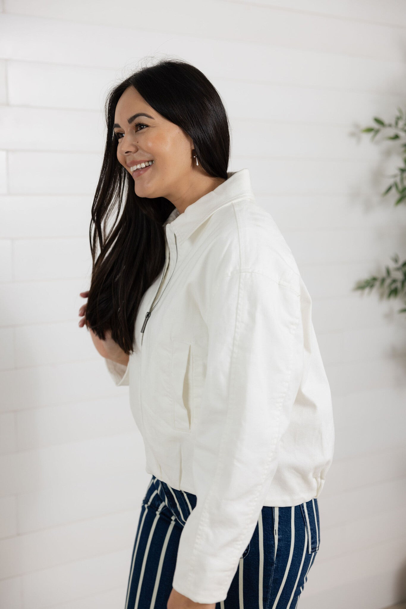 Crisp, clean, and endlessly versatile—this zip front white jacket is your new closet MVP. Layer it over everything from casual tees to dresses, or wear it solo for an effortlessly polished look. The front zip makes it easy to adjust your vibe throughout the day, while the timeless white hue pairs with literally any outfit in your rotation. Perfect for transitional weather or adding that extra polish to your everyday style.