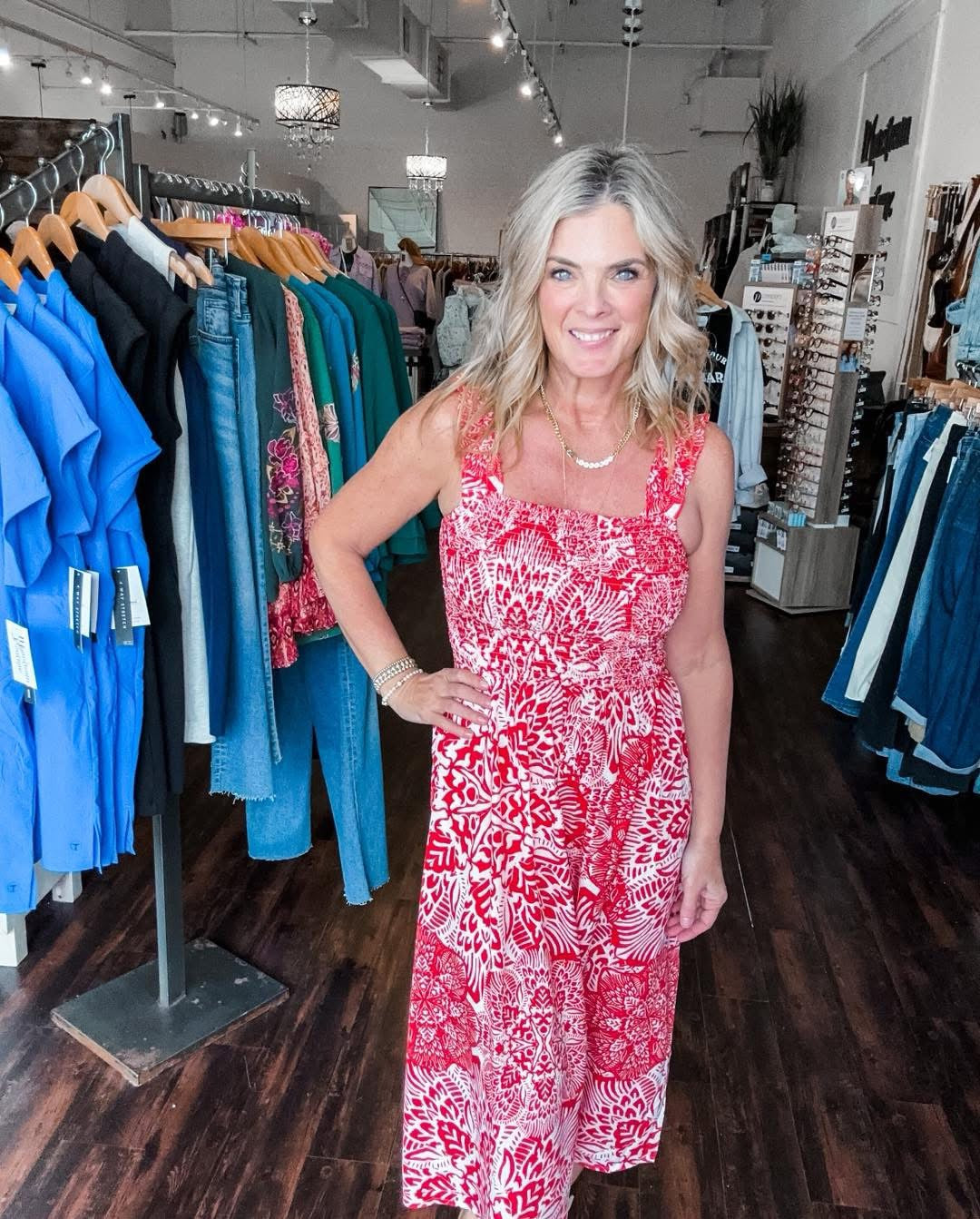 Turn heads in this Red Printed Dress with playful shirring detail that adds a flirty, flattering touch. Its vibrant print makes every step feel like a celebration, while the gathered fabric enhances your silhouette with lively texture. Perfect for days when you want to feel bold, bright, and effortlessly charming.