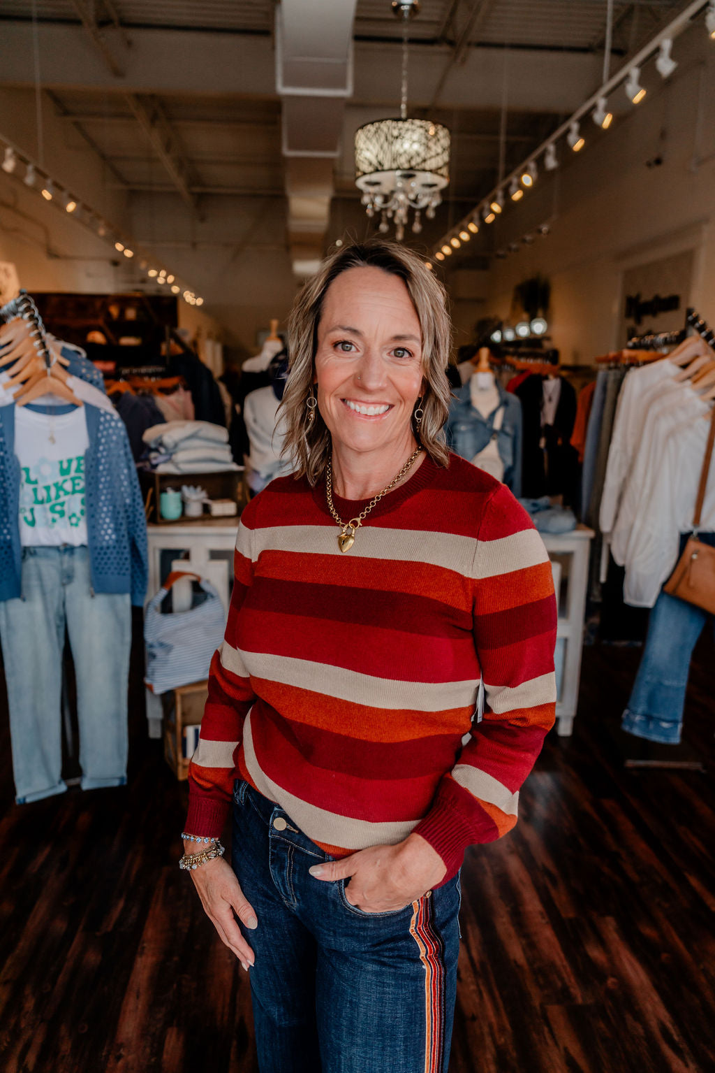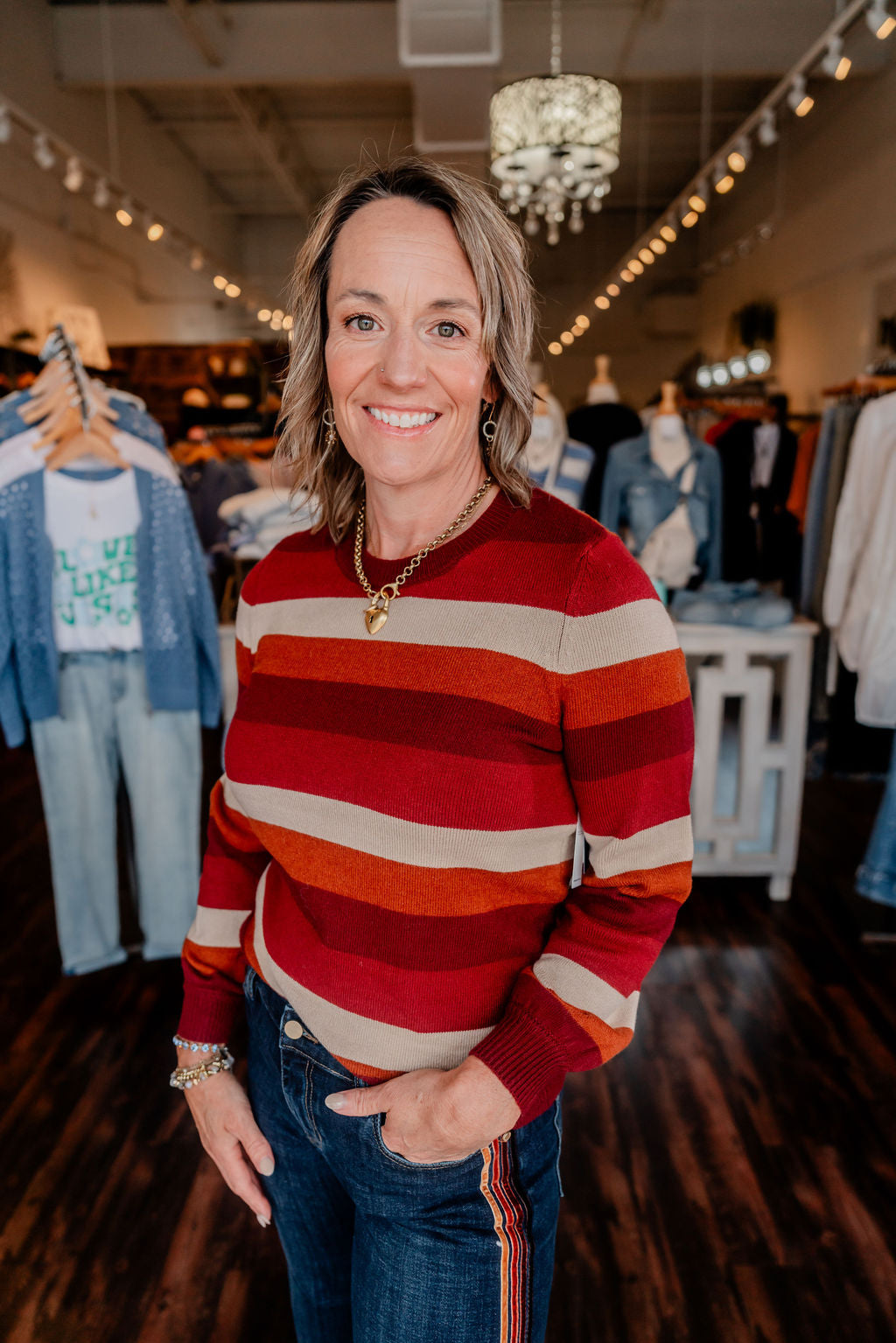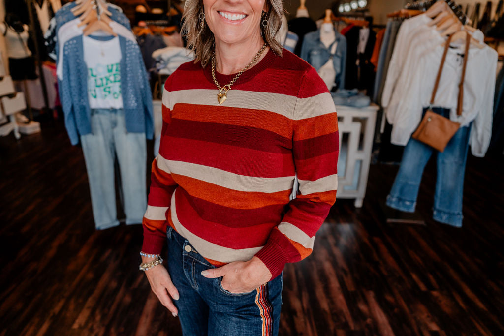 Infuse your fall and winter wardrobe with bold warmth in this colorblock striped sweater. Featuring rich hues of wine, rust, and camel in wide horizontal stripes, this cozy knit brings playful retro charm with modern versatility. The soft crew neckline and subtly ballooned sleeves add a feminine touch, while the relaxed fit makes it an effortless go-to for chilly days.
