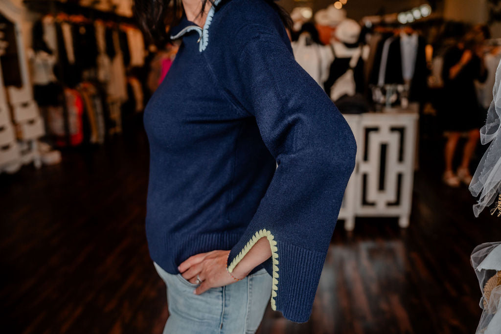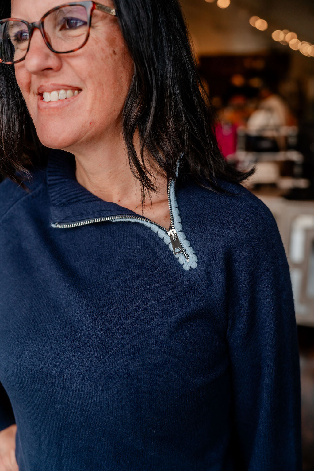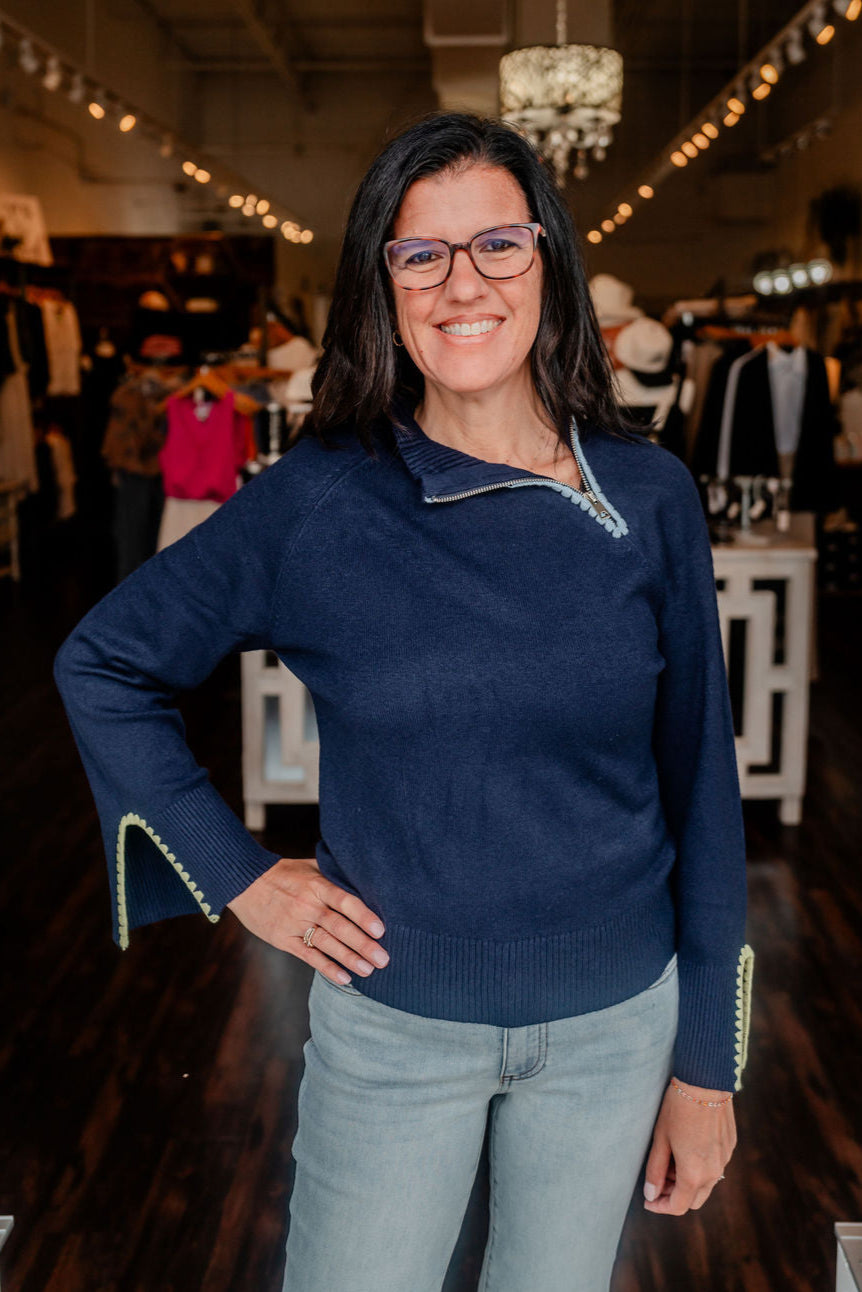 Mock Neck Sweater w/ Zipper & Crochet Details