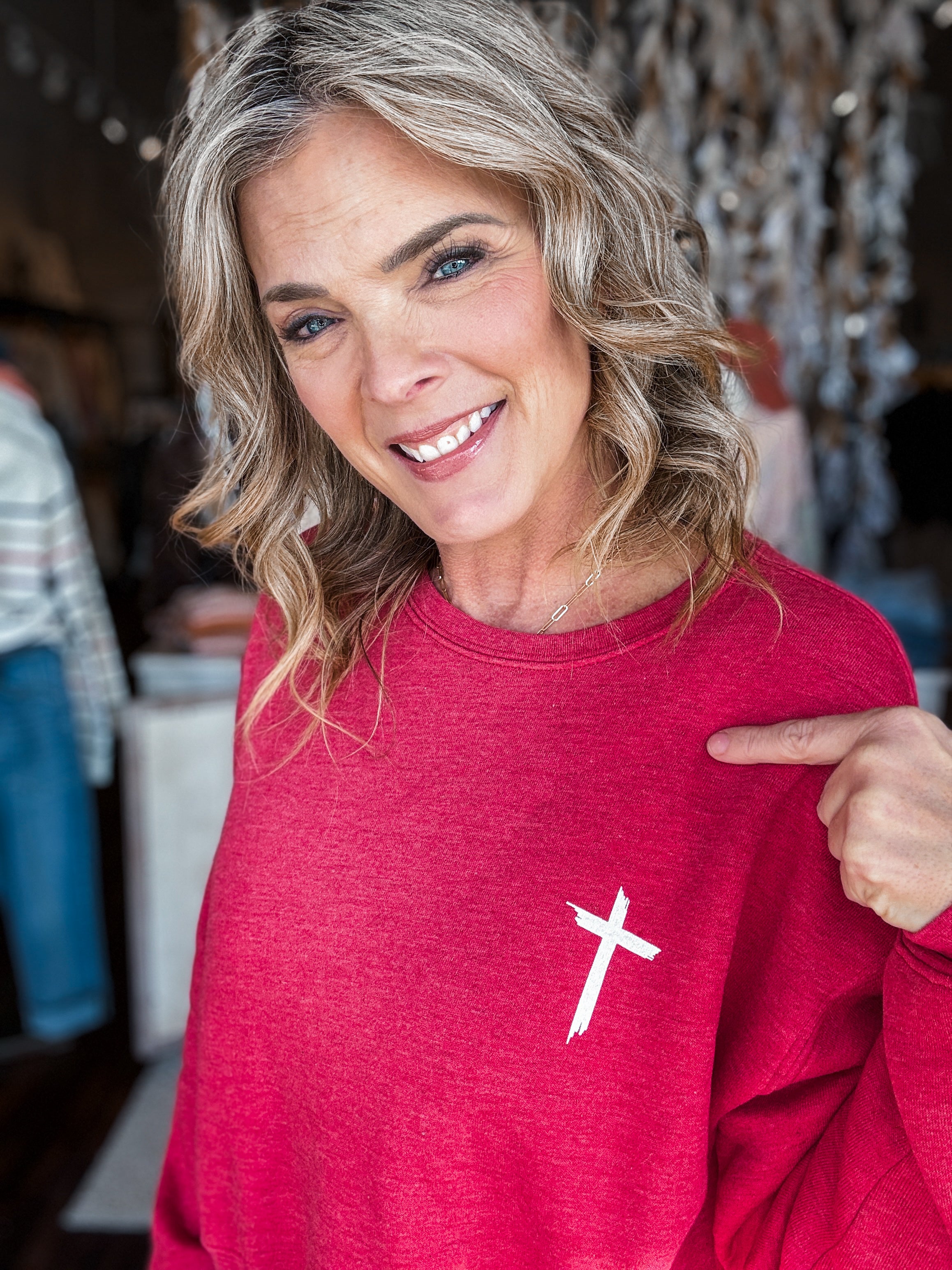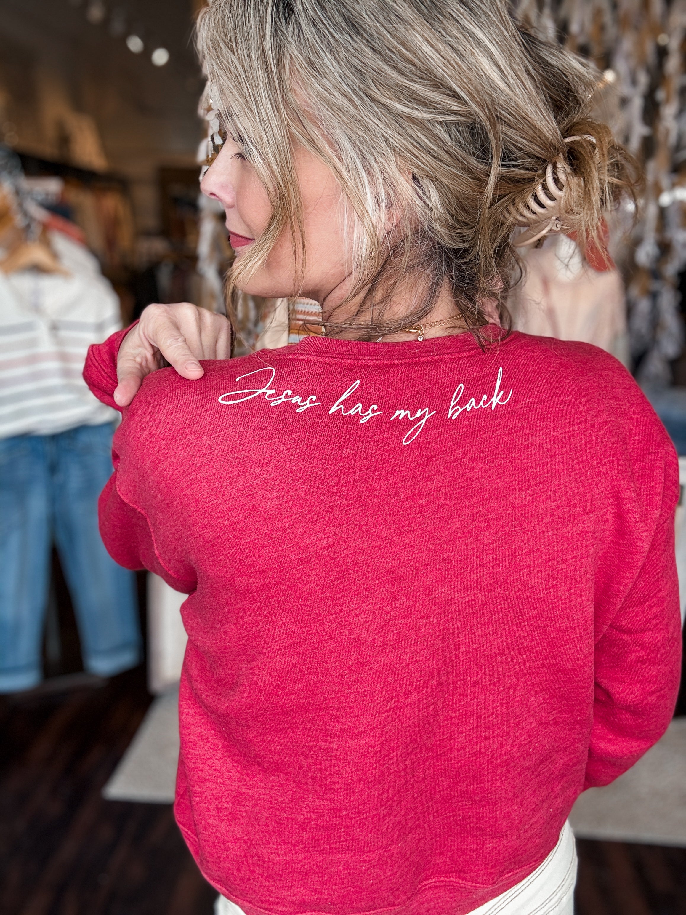 Jesus Has My Back Mid Cropped Graphic Sweatshirt Wear your faith with a fun twist in this mid-cropped graphic sweatshirt. Featuring a bold, eye-catching design that sparks conversation, it's perfect for casual days when you want to express your beliefs with style. The comfortable fit and soft fabric make it an easy go-to for layering or solo wear. A playful way to show what matters most—all while looking effortlessly cool.