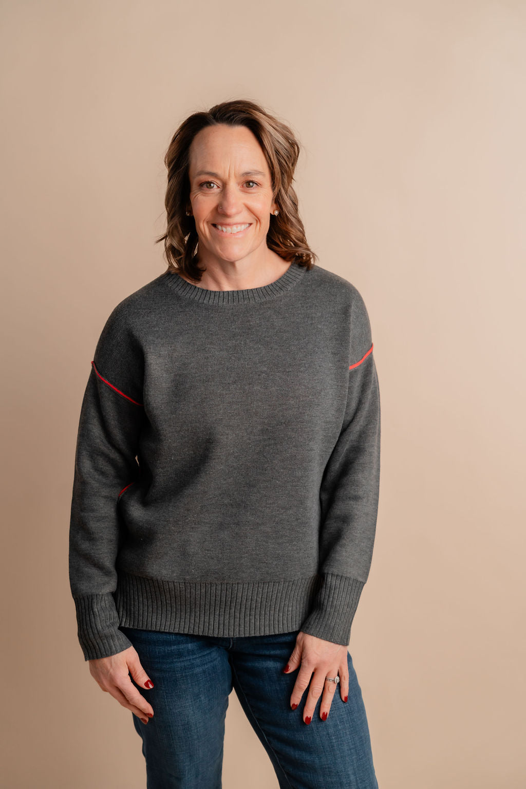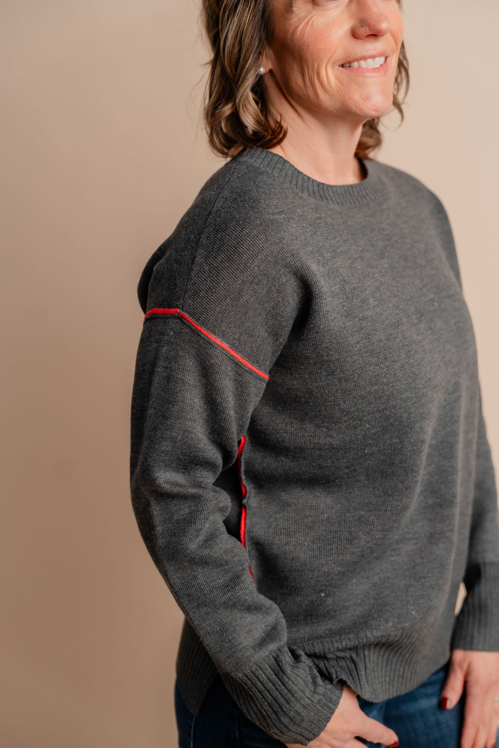 Cozy up with this playful round neck sweater, featuring eye-catching contrast trim that adds a pop of fun to your everyday look. Soft and comfortable, it’s perfect for layering or wearing solo when you want to keep things light and lively. Brighten your wardrobe with a sweater that’s anything but boring!