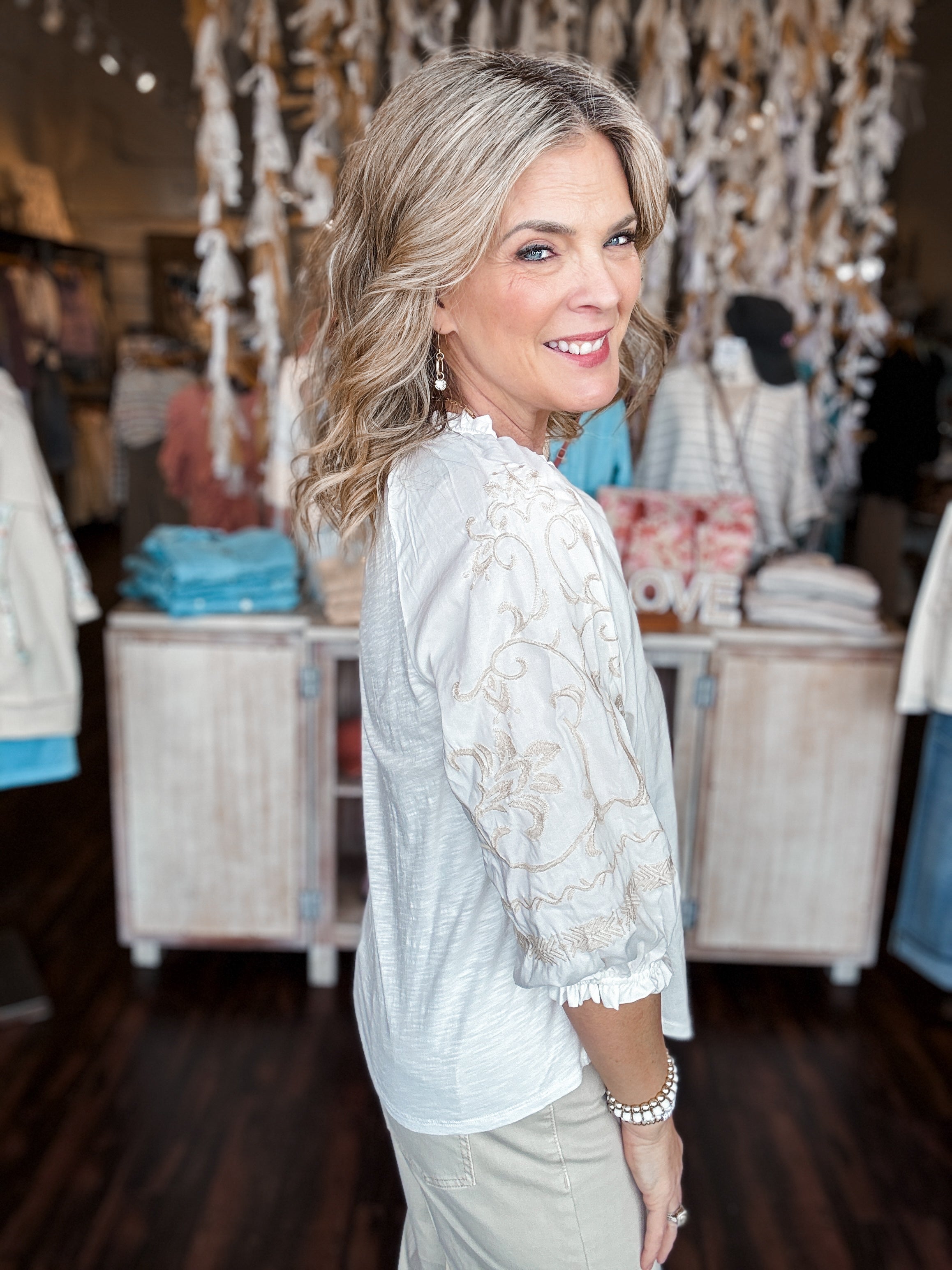 Textured Embroidered Cotton Raglan Long Sleeve Blouse