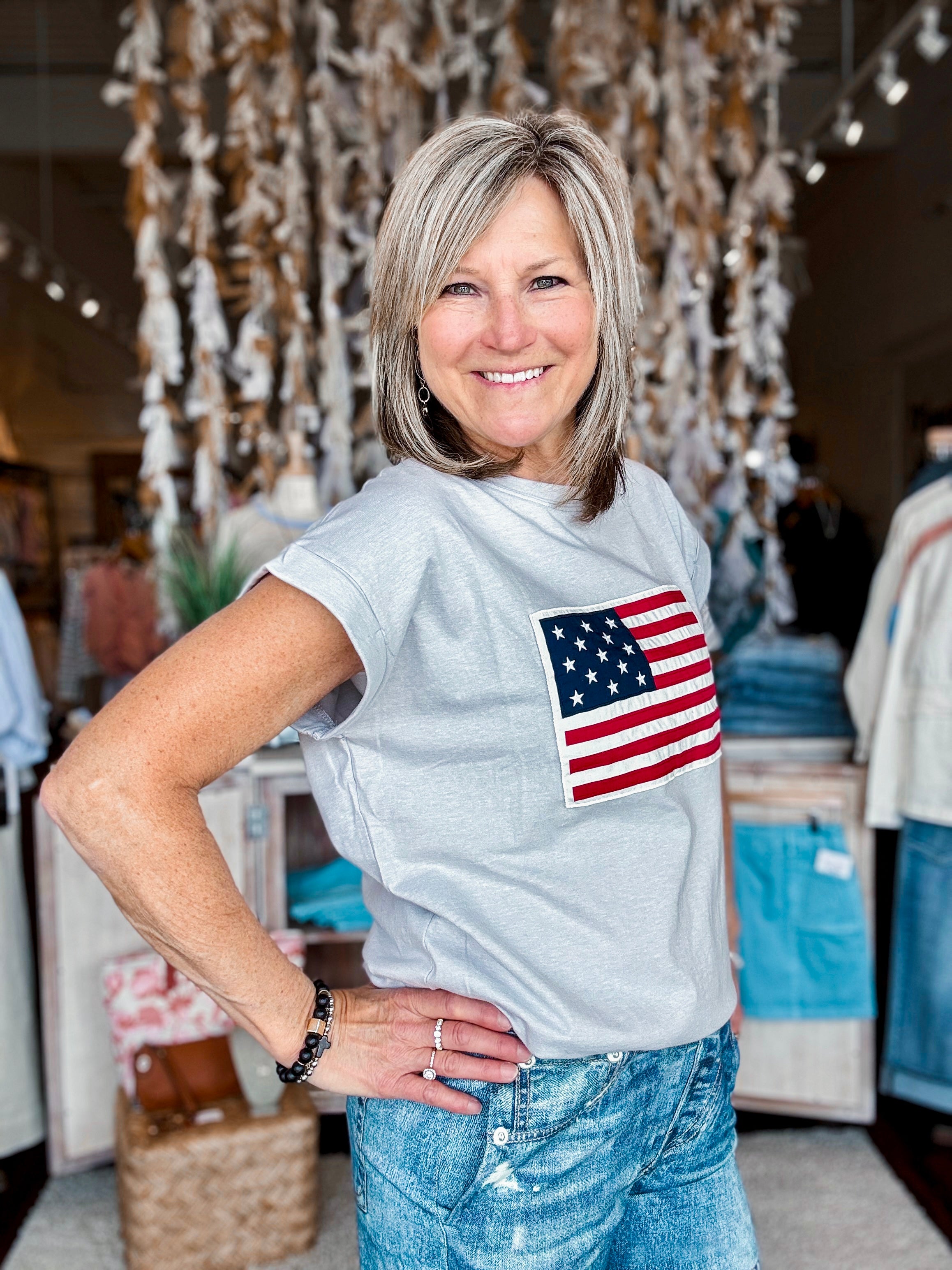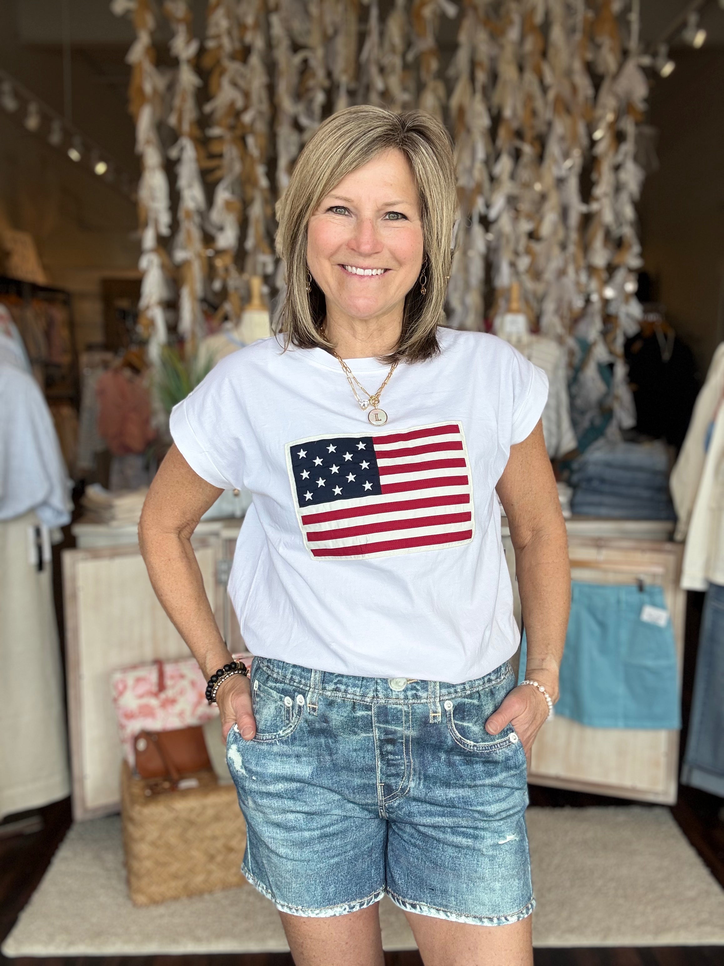 American Flag Tee Wear your patriotic spirit with a playful twist. This classic tee celebrates American pride in a fresh, modern way—perfect for casual outings, weekend hangouts, or whenever you want to show your colors. Crafted for comfort and durability, it's a wardrobe staple that works with everything from jeans to shorts. Simple, bold, and unapologetically American.