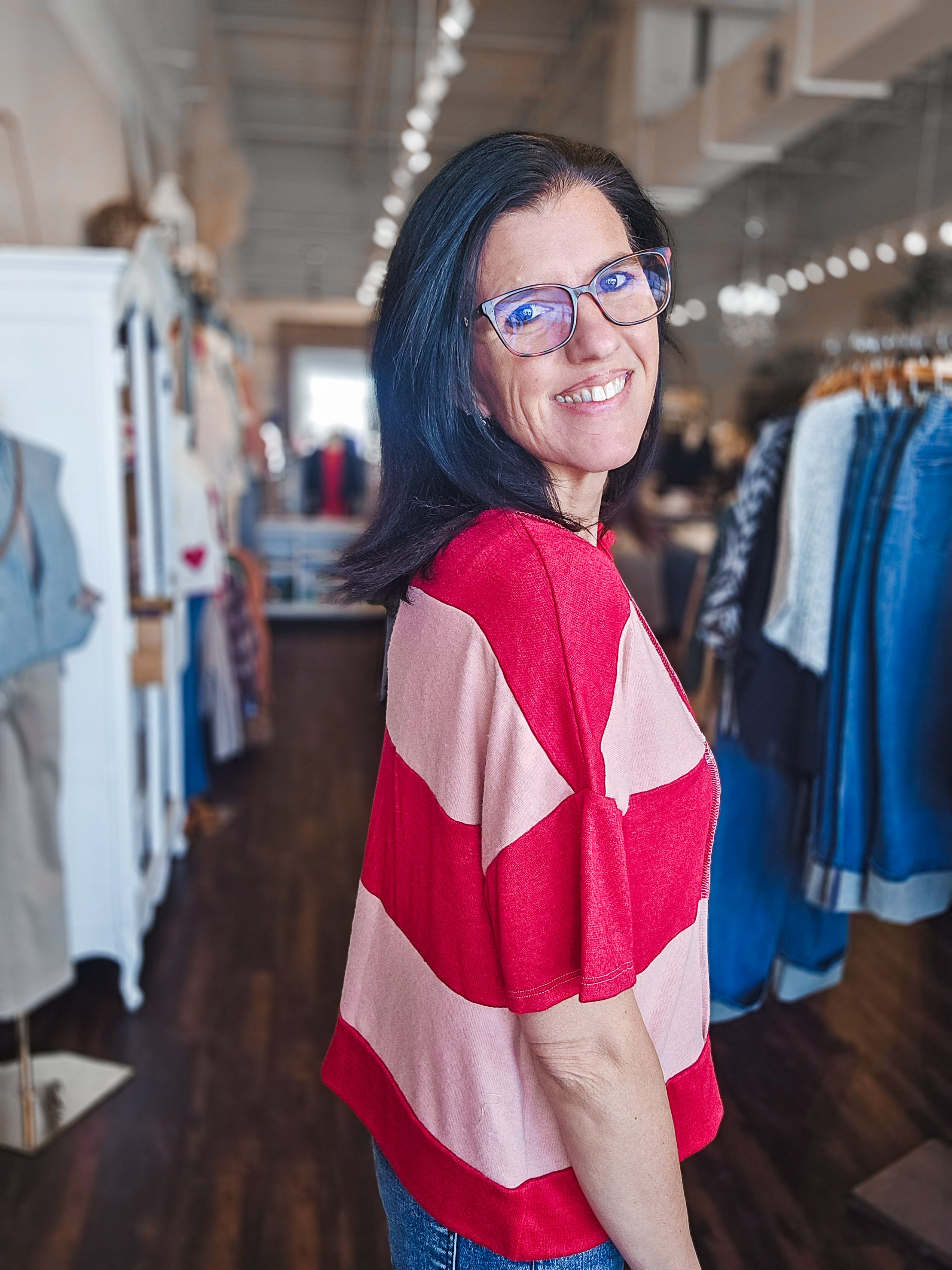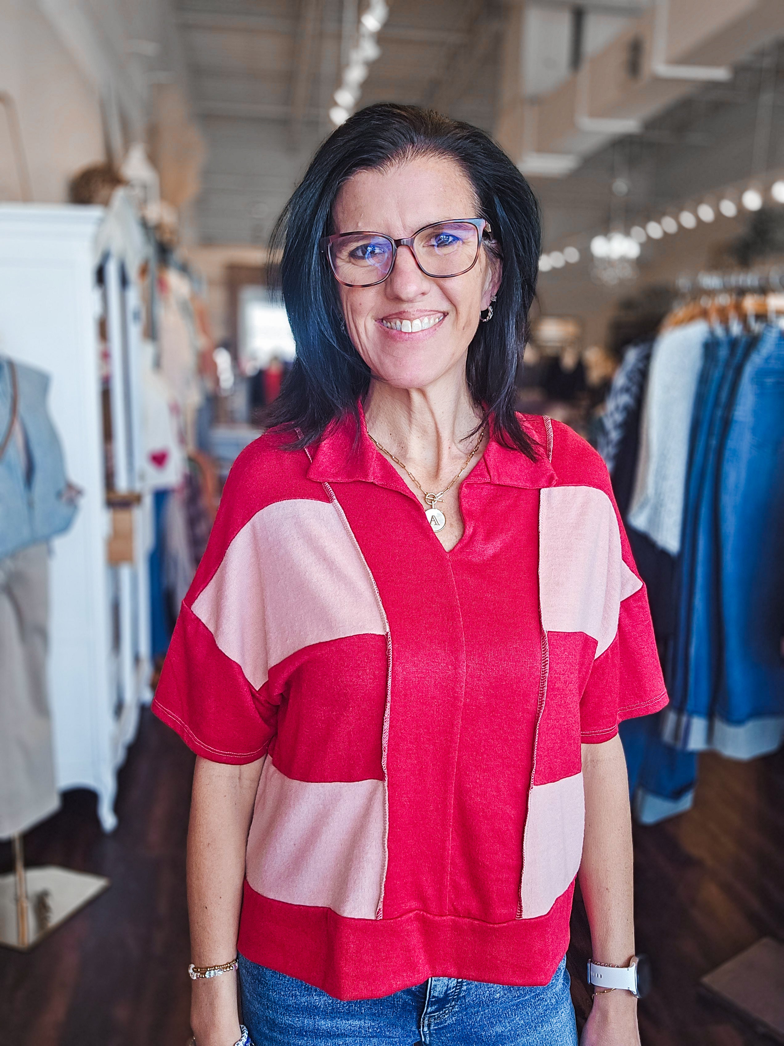 Mixing colors and making a statement—this color block top does both with effortless style. The notched collar adds a sharp, modern edge while short sleeves keep things breezy and versatile. Layer it over a tee, pair it with your favorite jeans, or dress it up for a night out. A wardrobe essential that works as hard as you do, with personality to spare.