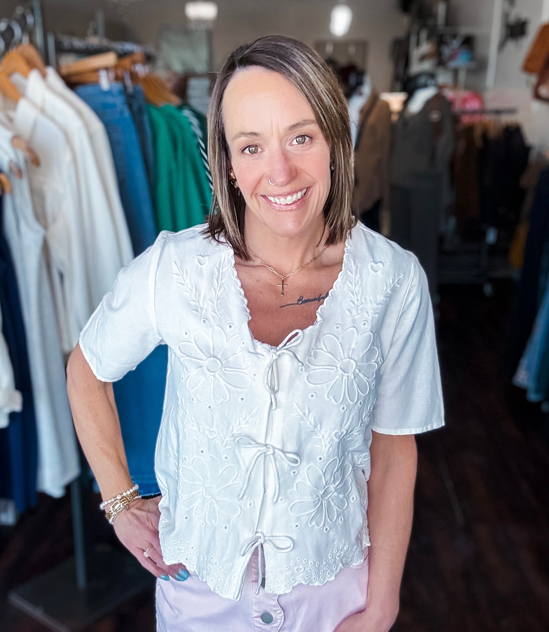 Add a touch of whimsy to your wardrobe with this elbow sleeve blouse featuring delicate floral embroidery. The playful tied V-neck adds a flirty twist, making it perfect for casual days or brunch with friends. Lightweight and breezy, it combines comfort with charming style effortlessly.