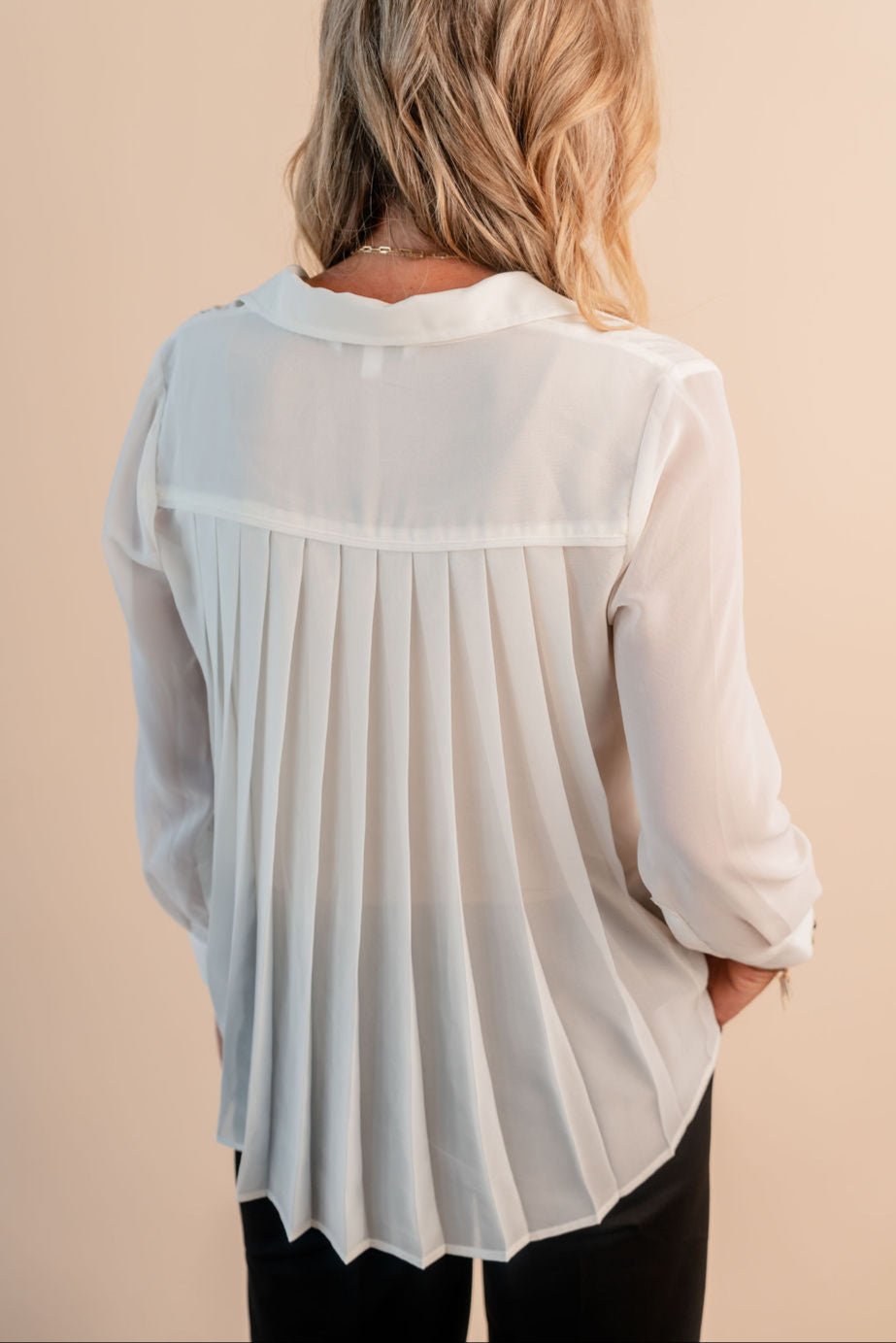 Breeze through your day in the Ivory Accordion Back Floaty Button Down Top. Its lightweight fabric and airy accordion back create a fun, floaty silhouette that moves with you. The classic button-down front adds polish, while the playful design keeps your look fresh and lively for any occasion.