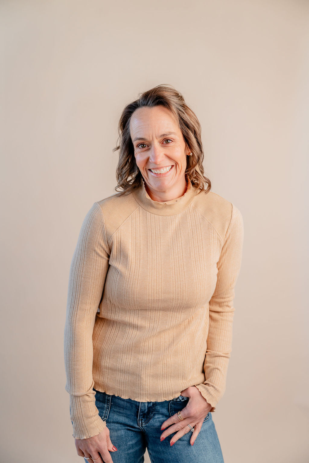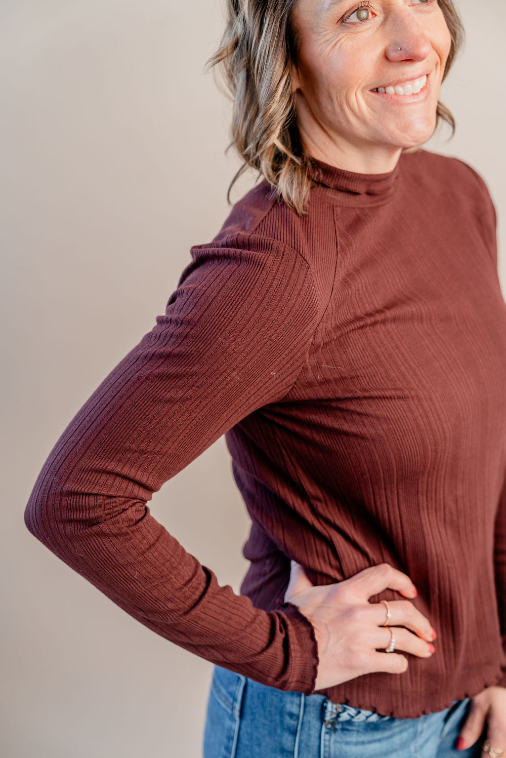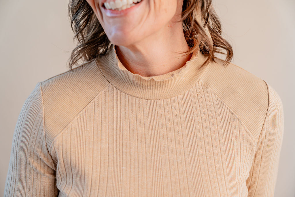 Turn heads with this Long Sleeve Mock Neck Mixed Media Knit Top featuring a flirty lettuce edge trim. The cozy knit blends comfort with a dash of quirky charm, while the mock neck adds a touch of sophistication. Perfect for layering or wearing solo, this playful top spices up any outfit with its unique textures and fun details.