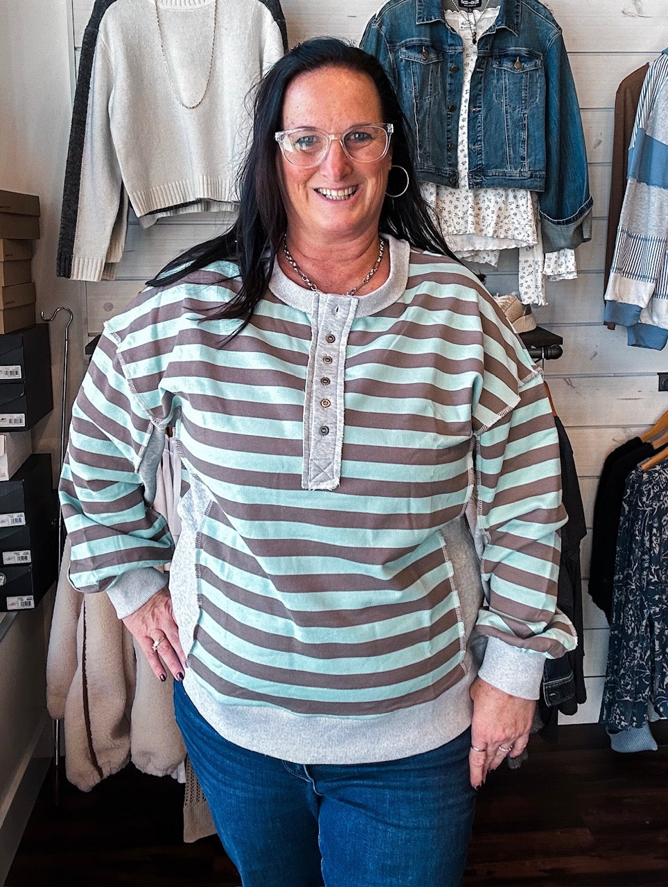 Effortless layering meets laid-back style with this oversized striped knit top. The half button-down front gives you easy styling options—wear it buttoned for a polished look or leave it open as a chic cover-up. Soft, breathable knit fabric keeps you comfortable all day, while the relaxed fit works beautifully over basics or paired with your favorite denim. A modern striped pattern adds visual interest without demanding attention. Perfect for casual outings, weekend hangouts, or whenever you want to look put-together without trying too hard.