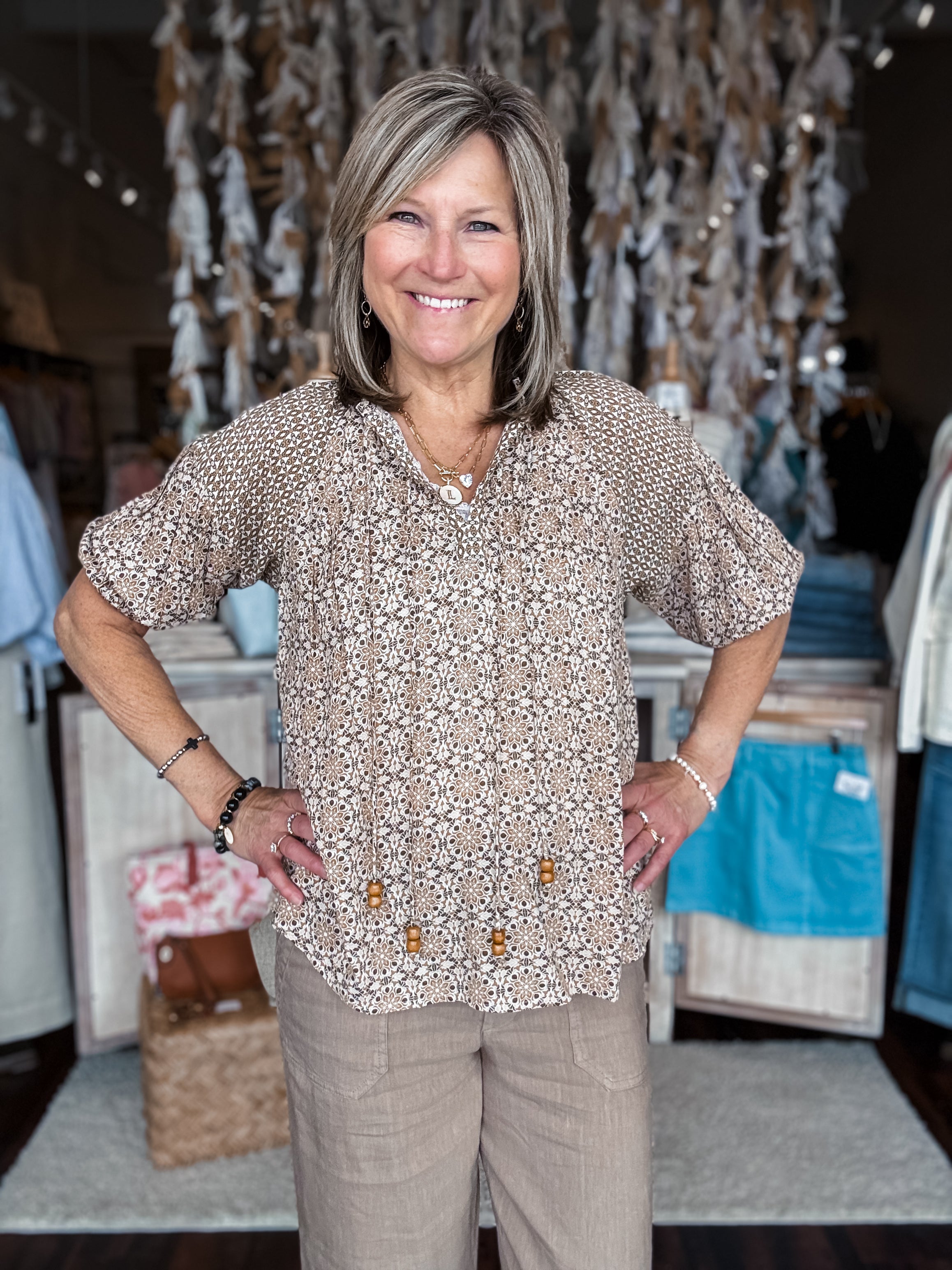 Short Sleeve Boho Top Effortless bohemian vibes meet everyday comfort in this breezy short-sleeve top. Crafted with relaxed proportions and thoughtful details, it's the perfect layering piece for spring transitions or standalone wear. Pair it with your favorite denim, linen pants, or a flowing skirt for an undeniably cool, laid-back look that works from brunch to sunset strolls.