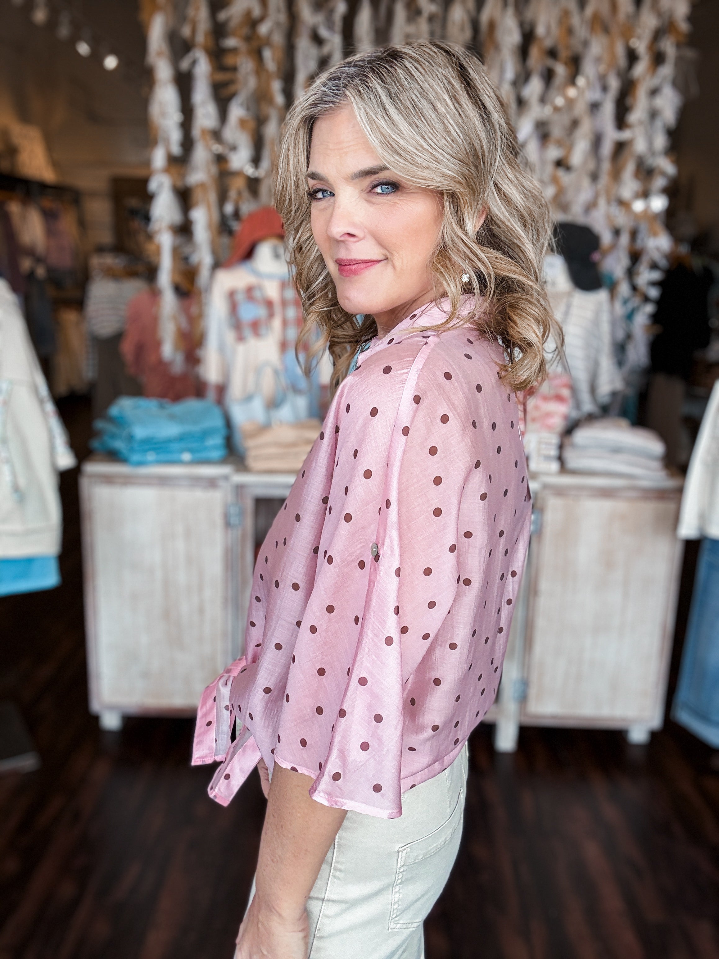 Effortless style meets comfort in this printed dolman sleeve blouse. The relaxed, flowing silhouette drapes beautifully while the front tie detail adds a charming focal point—perfect for dressing up or down. Roll-up sleeves let you adjust the look to match your vibe, whether you're heading to brunch or the office. A versatile print keeps things interesting, making this blouse an instant favorite for mixing and matching with your everyday wardrobe.
