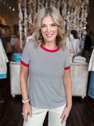 Crisp pinstripes meet playful color blocking in this short-sleeve crew neck top—a wardrobe staple that's anything but basic. The contrasting trim at the neckline and sleeves adds a pop of personality, while the classic pinstripe pattern keeps things polished and versatile. Perfect for layering or wearing solo, this piece transitions effortlessly from casual weekends to put-together weekday looks. A fun, flattering essential that works harder than it looks.