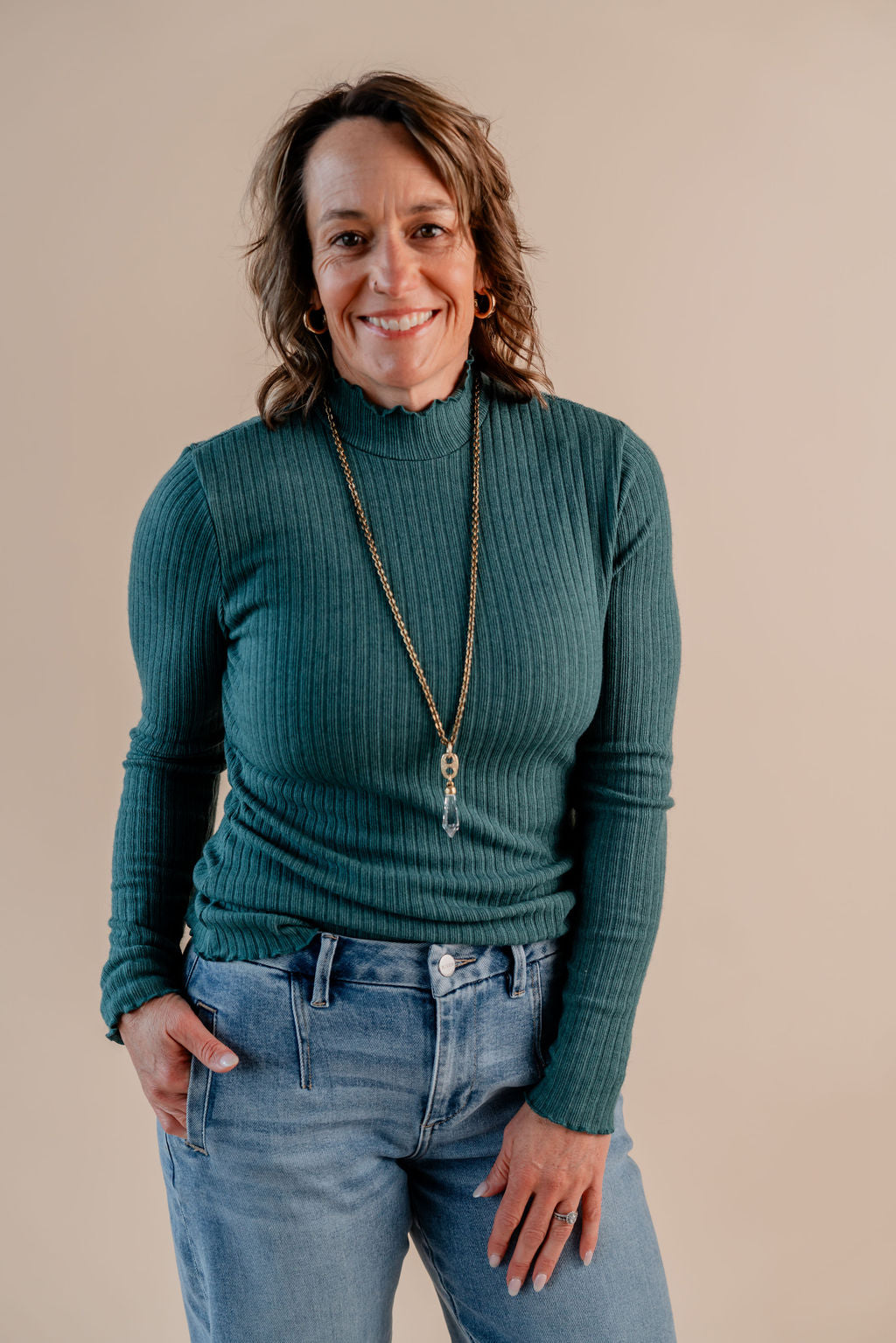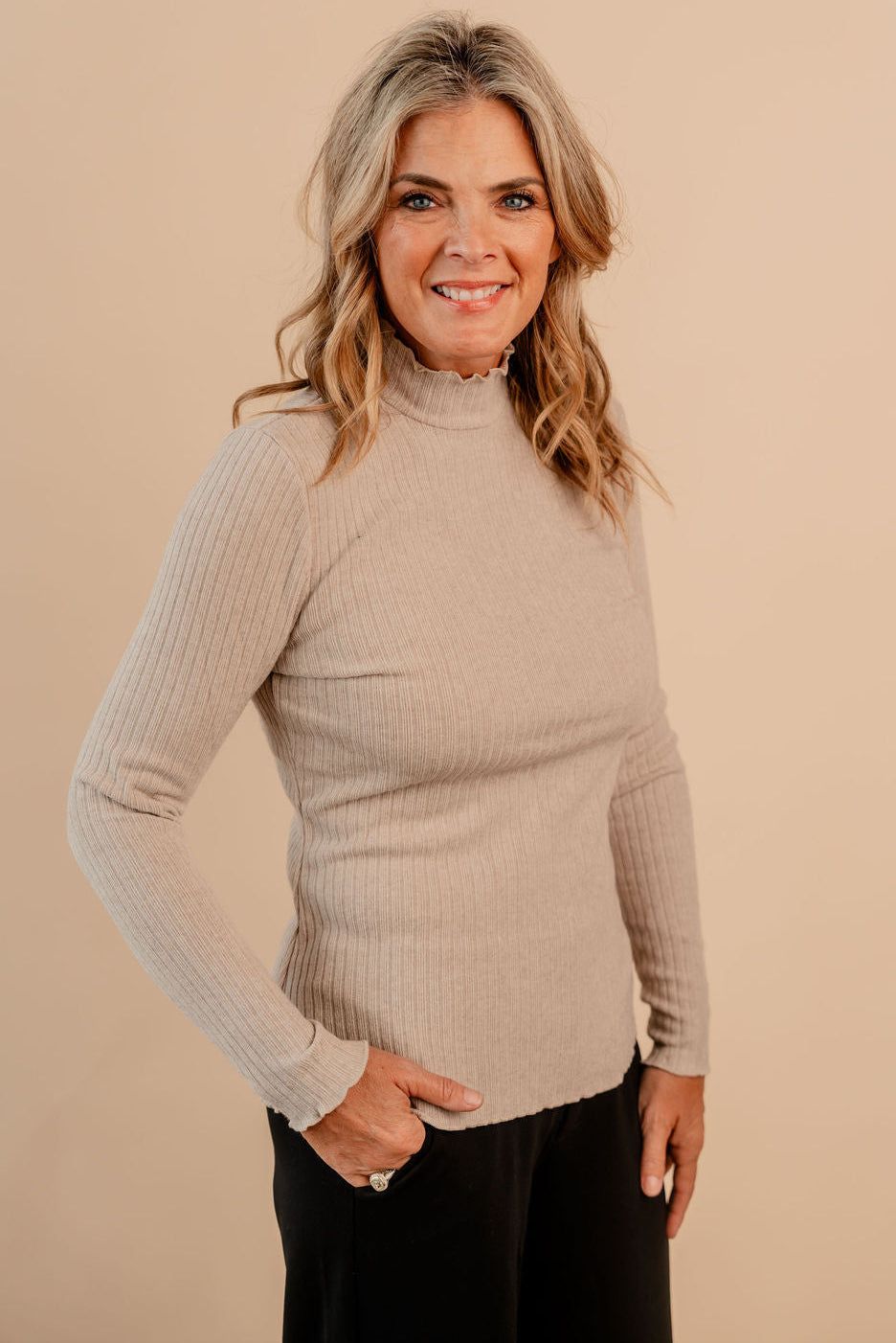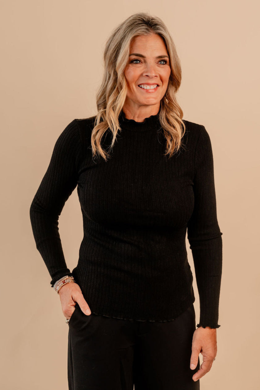 Mock Neck Lettuce Edged Long Sleeve Ribbed Top