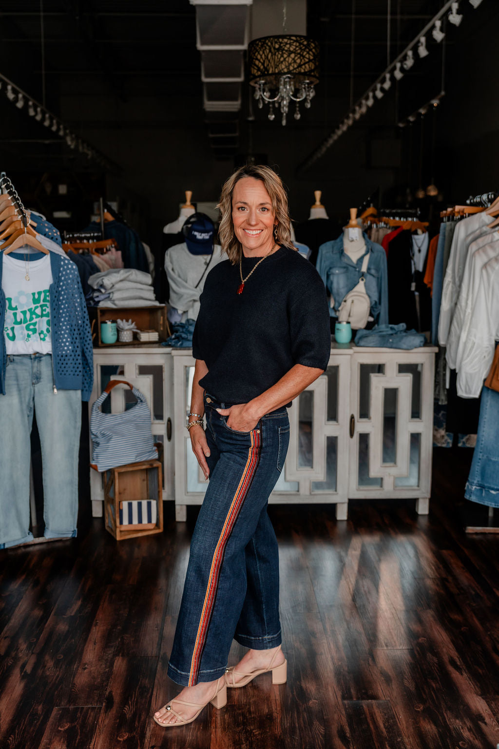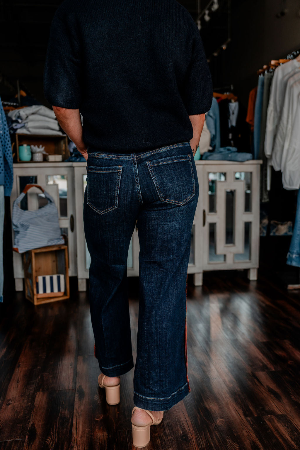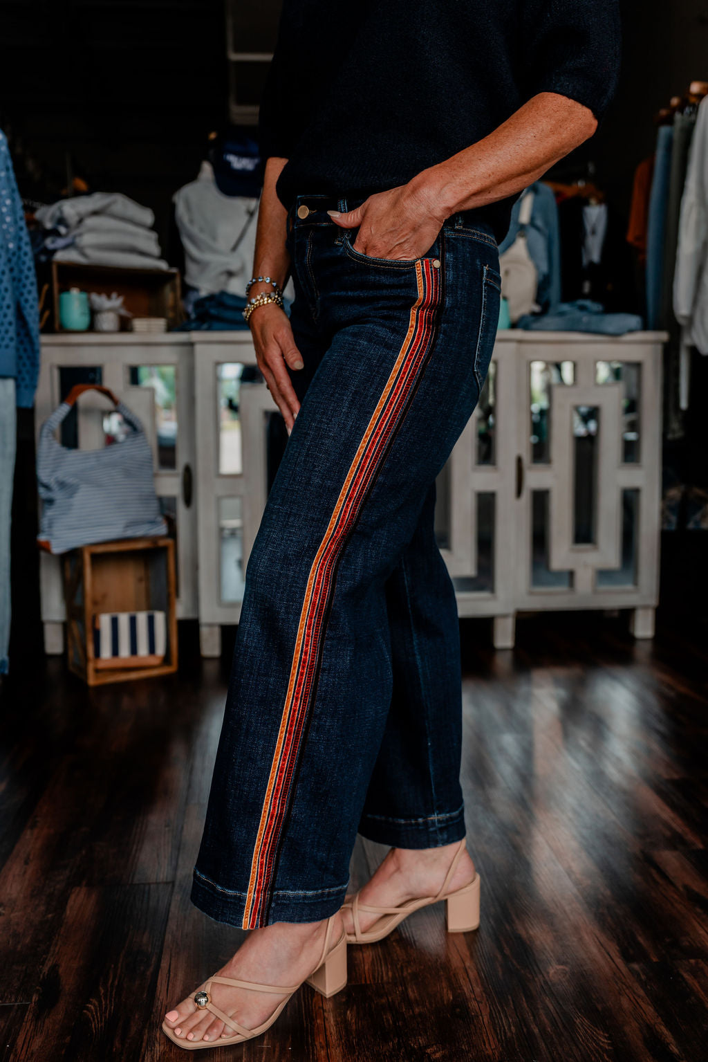 Step into statement style with these wide-leg jeans featuring a rich, multicolor velvet side stripe. The deep indigo wash offers a sophisticated base, while the striped trim in earthy tones of rust, gold, and burgundy adds a vintage-inspired twist. With a mid-rise fit and cropped, wide-leg silhouette, these jeans bring movement, personality, and undeniable flair to your everyday wardrobe.